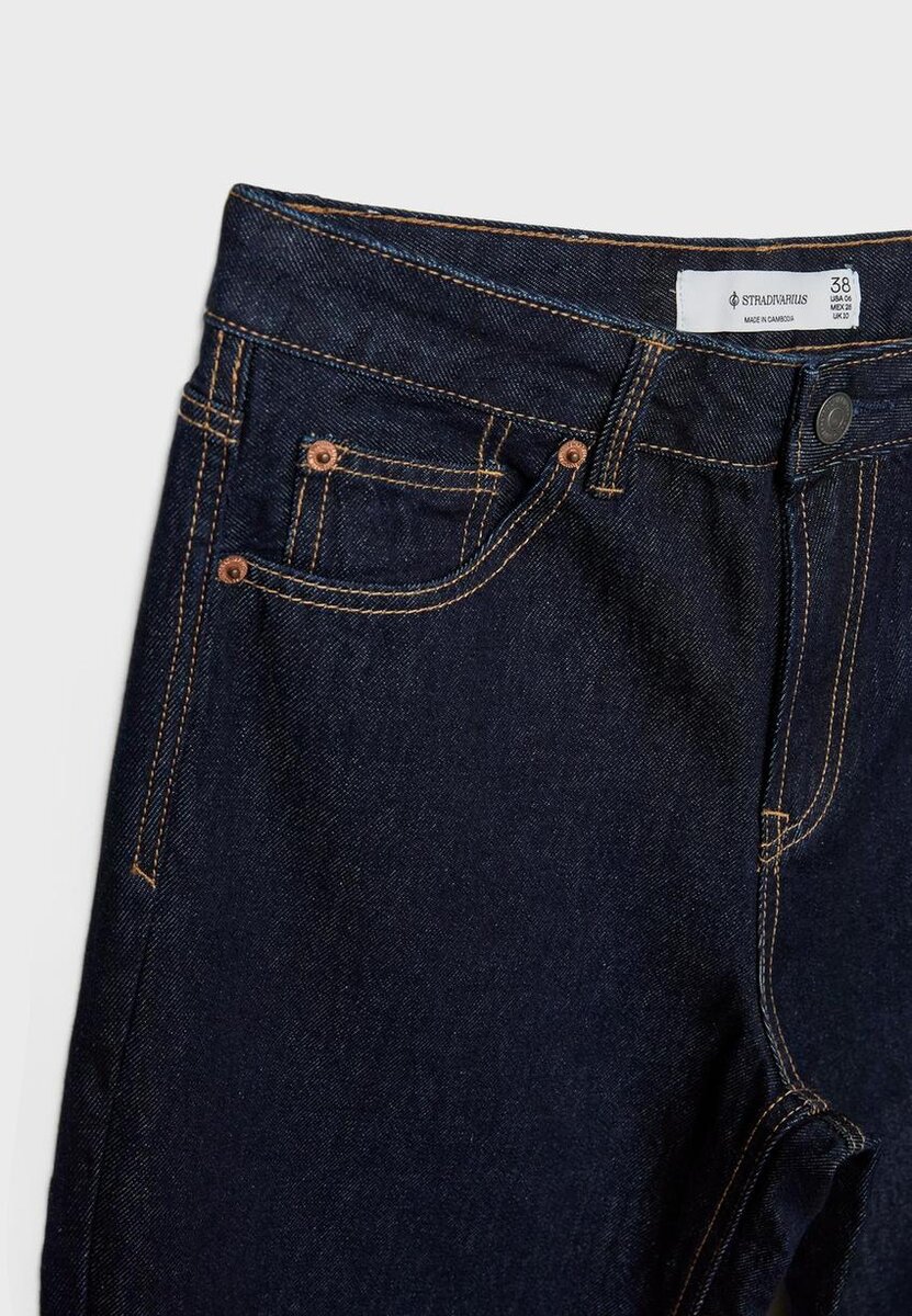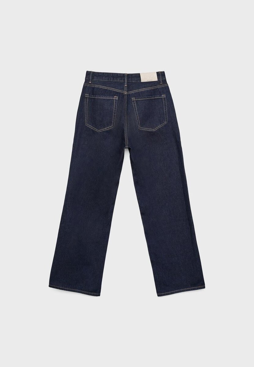 Jean droit à taille haute et coupe Wide Leg, modèle à cinq poches. Braguette zippée et fermeture par bouton métallique.