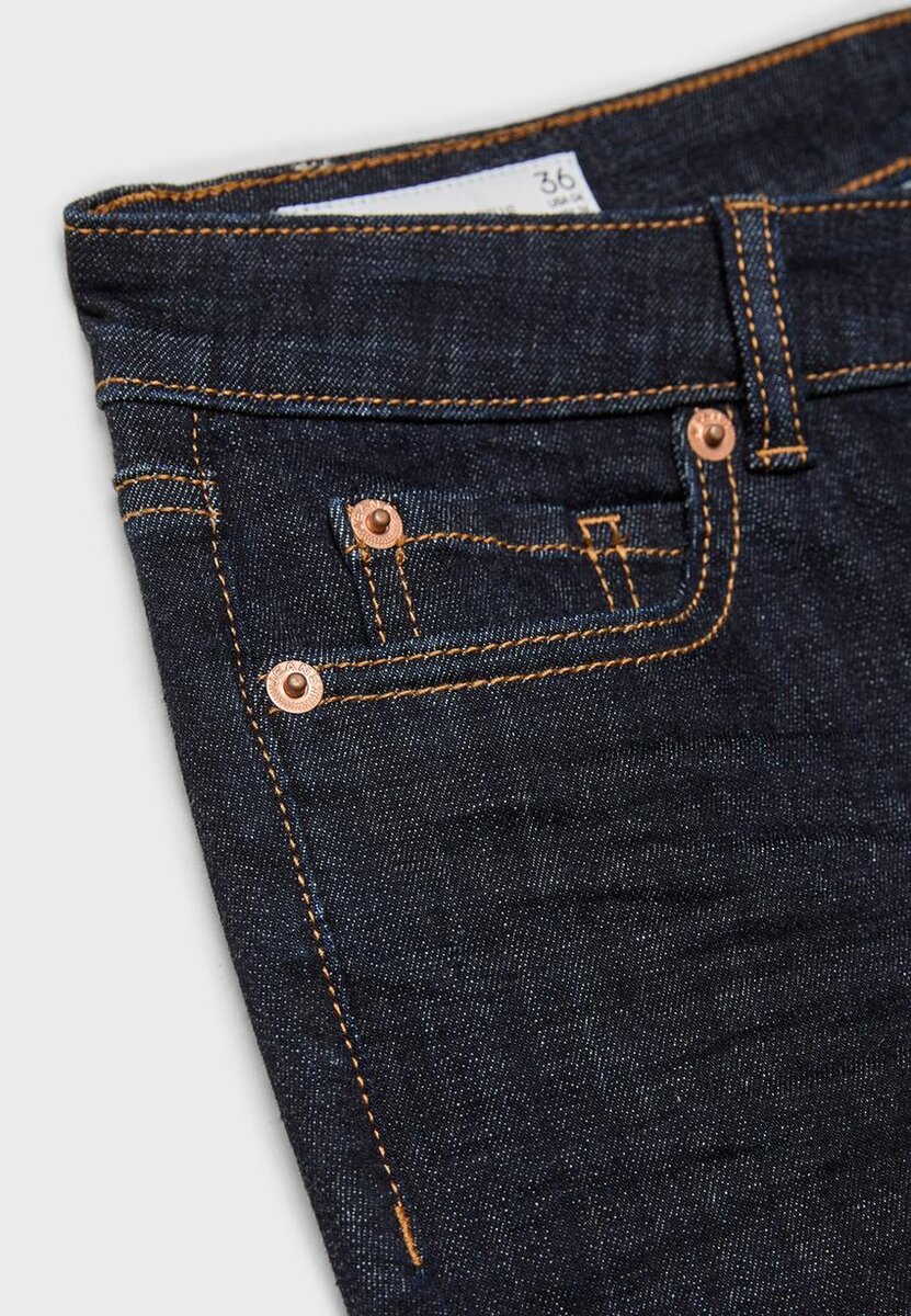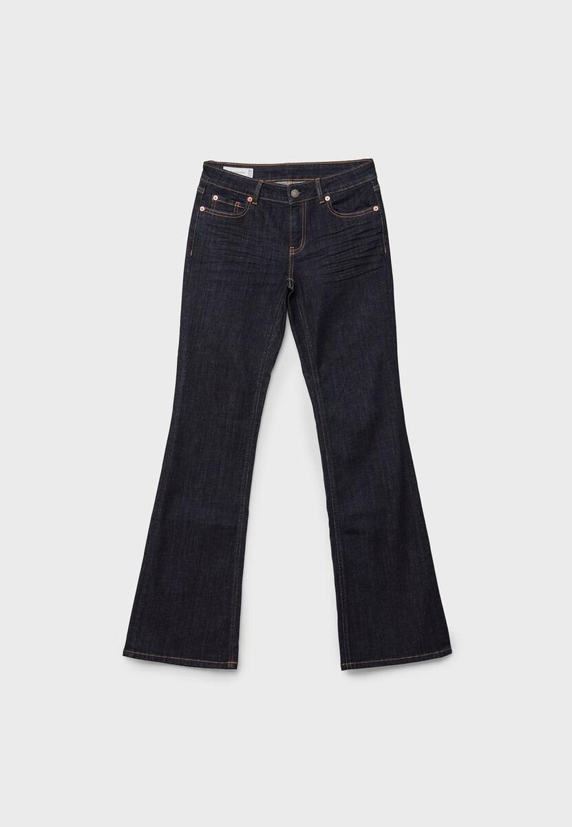 Jean taille basse avec passants de ceinture. Poches avant et poches plaquées arrière. Coupe ajustée jusqu’aux genoux et ourlets légèrement Flared. Disponible en plusieurs couleurs.