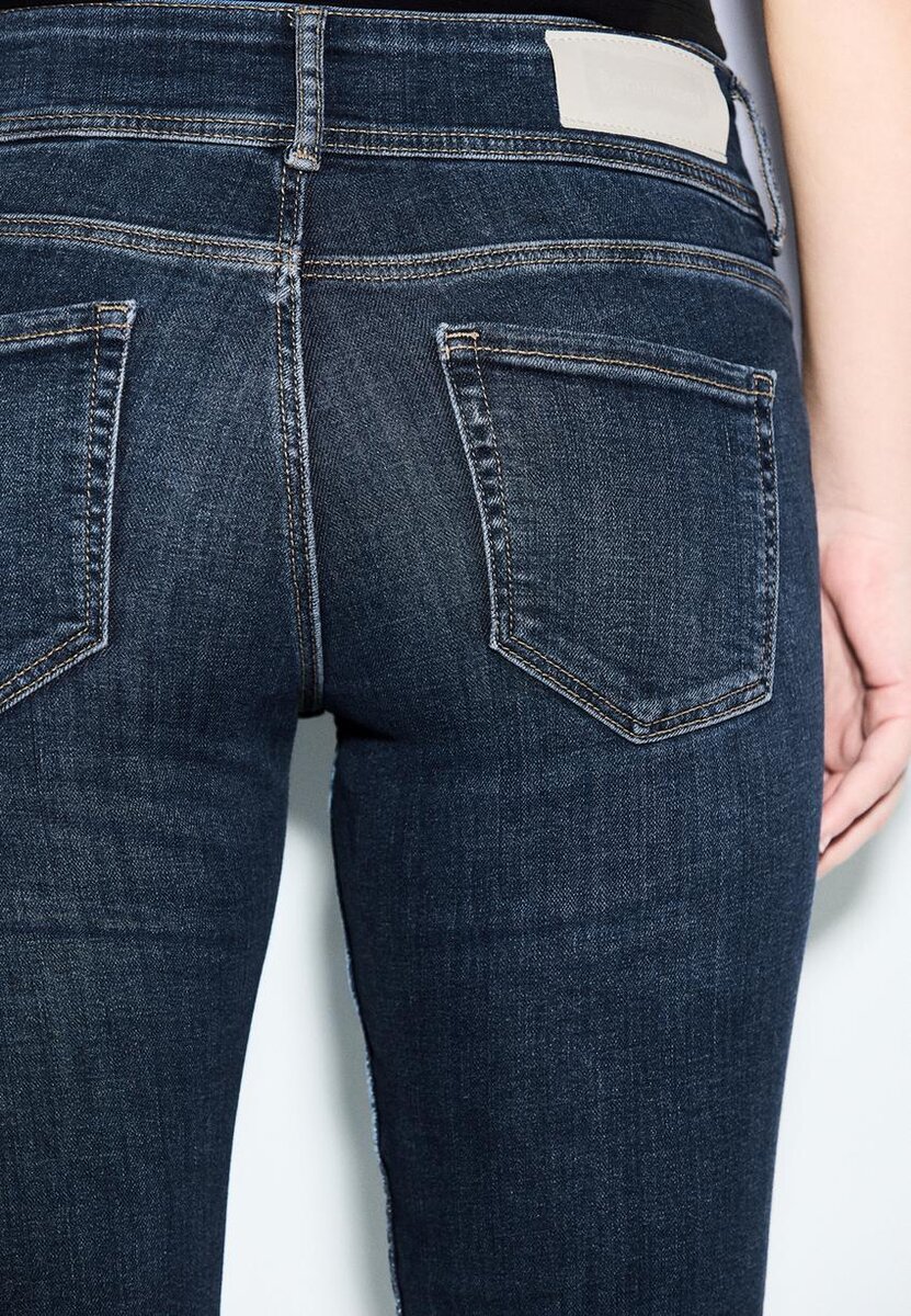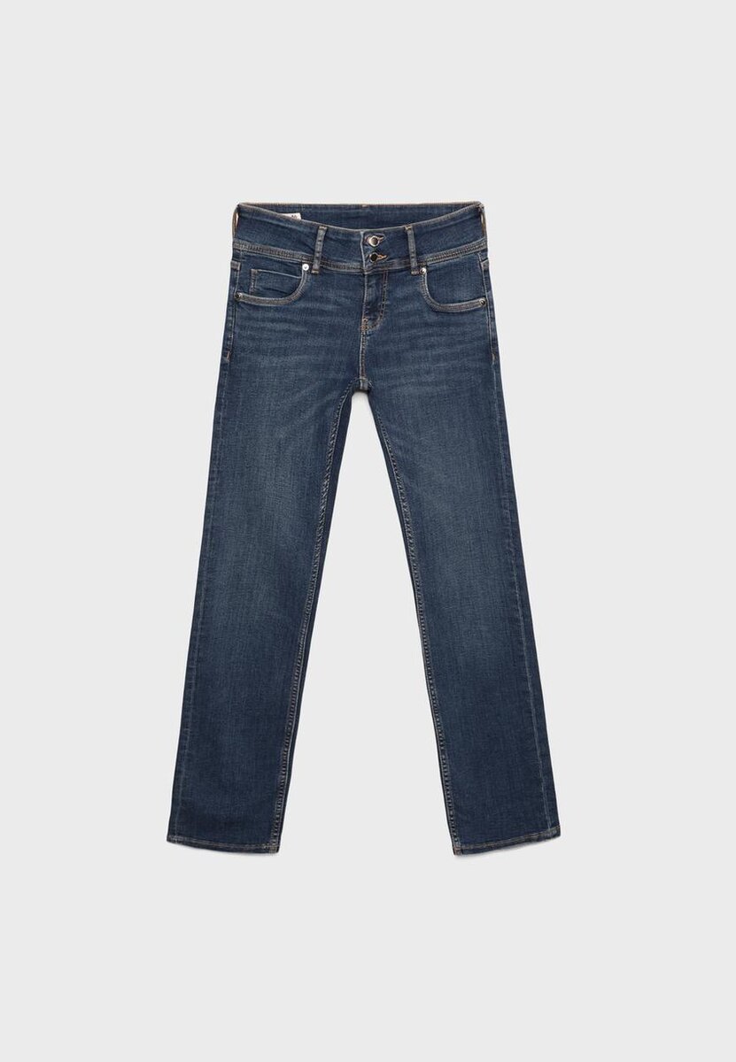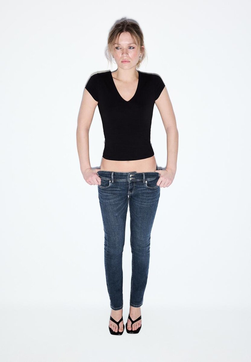 Jean slim taille basse à cinq poches. Fermeture à glissière sur le devant et double bouton métallique.