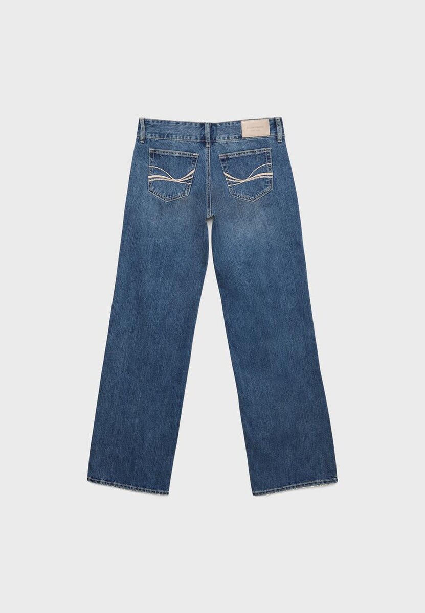Jean taille basse à coupe droite à cinq poches. Ceinture style marteau avec passants de ceinture. Fermeture à glissière sur le devant et double boutonnage. Détail gravé sur les poches arrière.