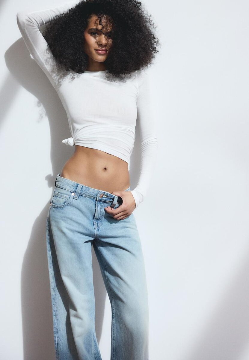 Jean taille basse à jambes larges. Avec passants de ceinture et design à cinq poches. Fermeture à glissière et bouton à l’avant. Motif étoile sur la poche arrière. Disponible en plusieurs couleurs.