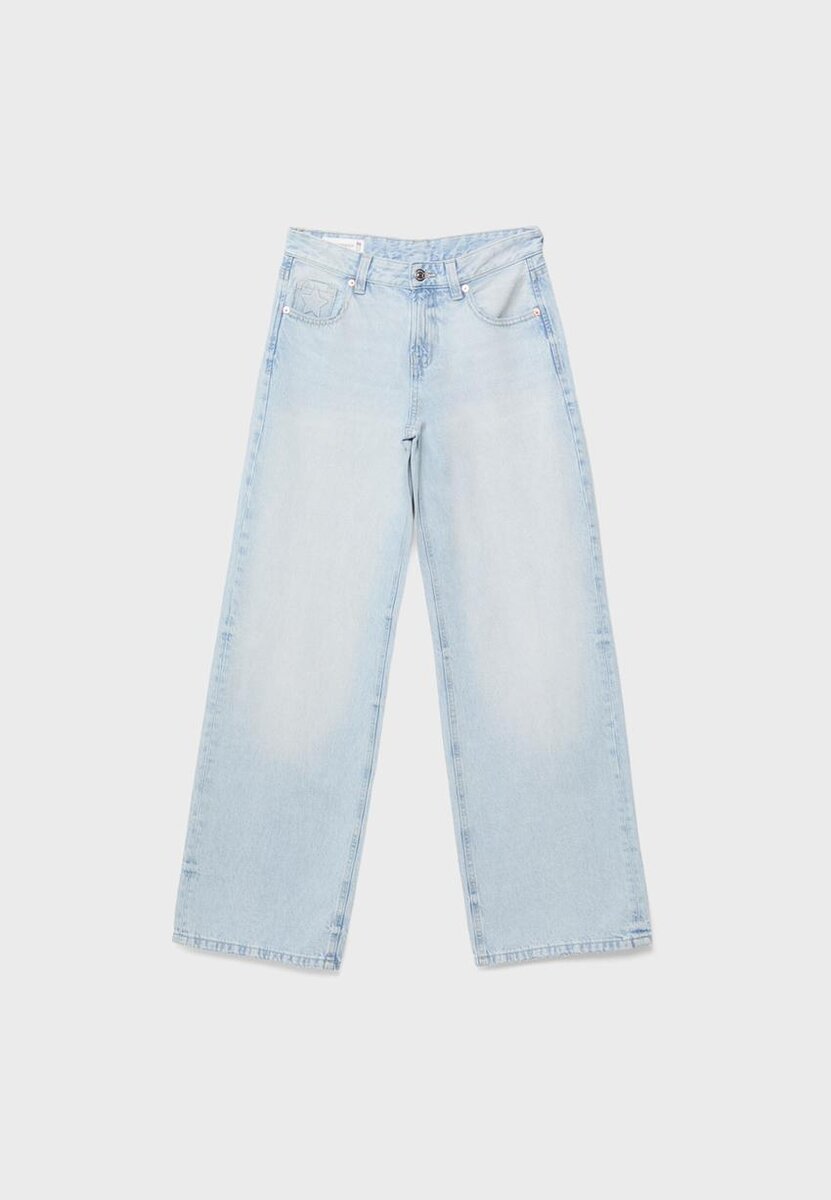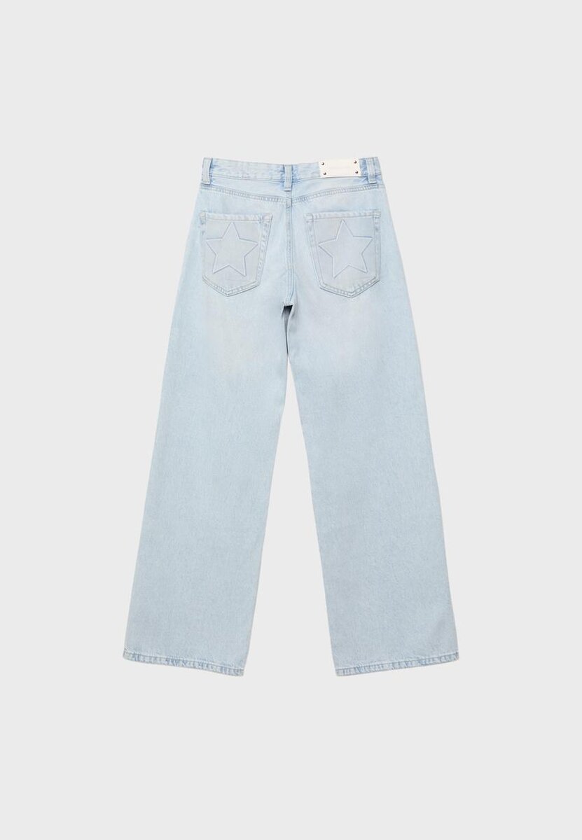 Jean taille basse à jambes larges. Avec passants de ceinture et design à cinq poches. Fermeture à glissière et bouton à l’avant. Détail étoile sur la poche arrière. Disponible en plusieurs couleurs.