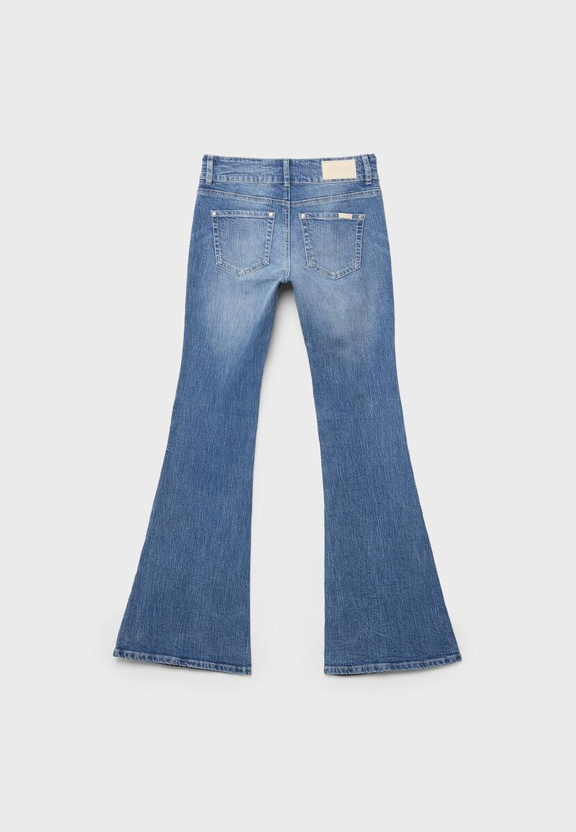 Jean taille basse avec passants de ceinture. Coupe slim avec bas flared. Poches avant et arrière avec coutures apparentes. Braguette zippée et fermeture à bouton.