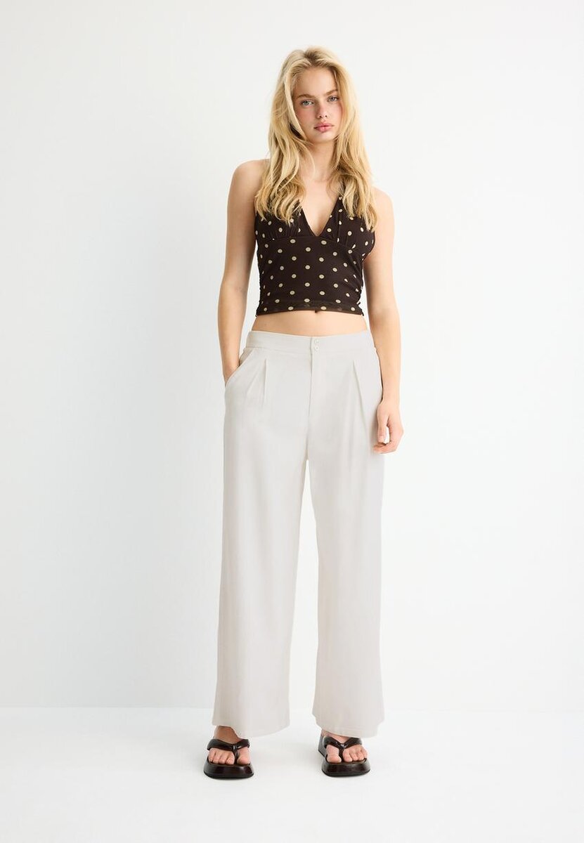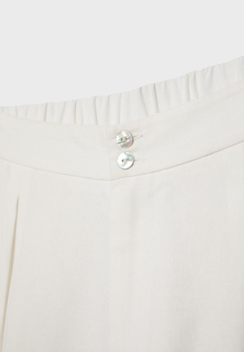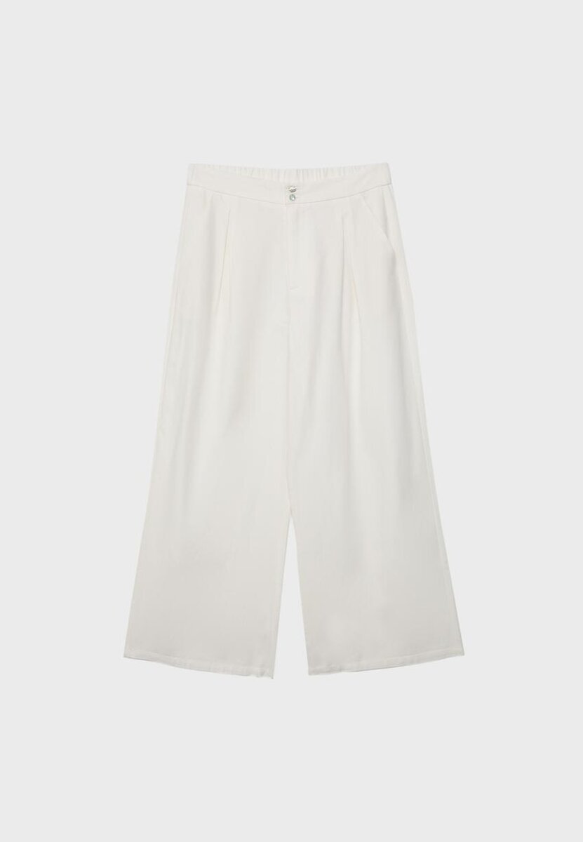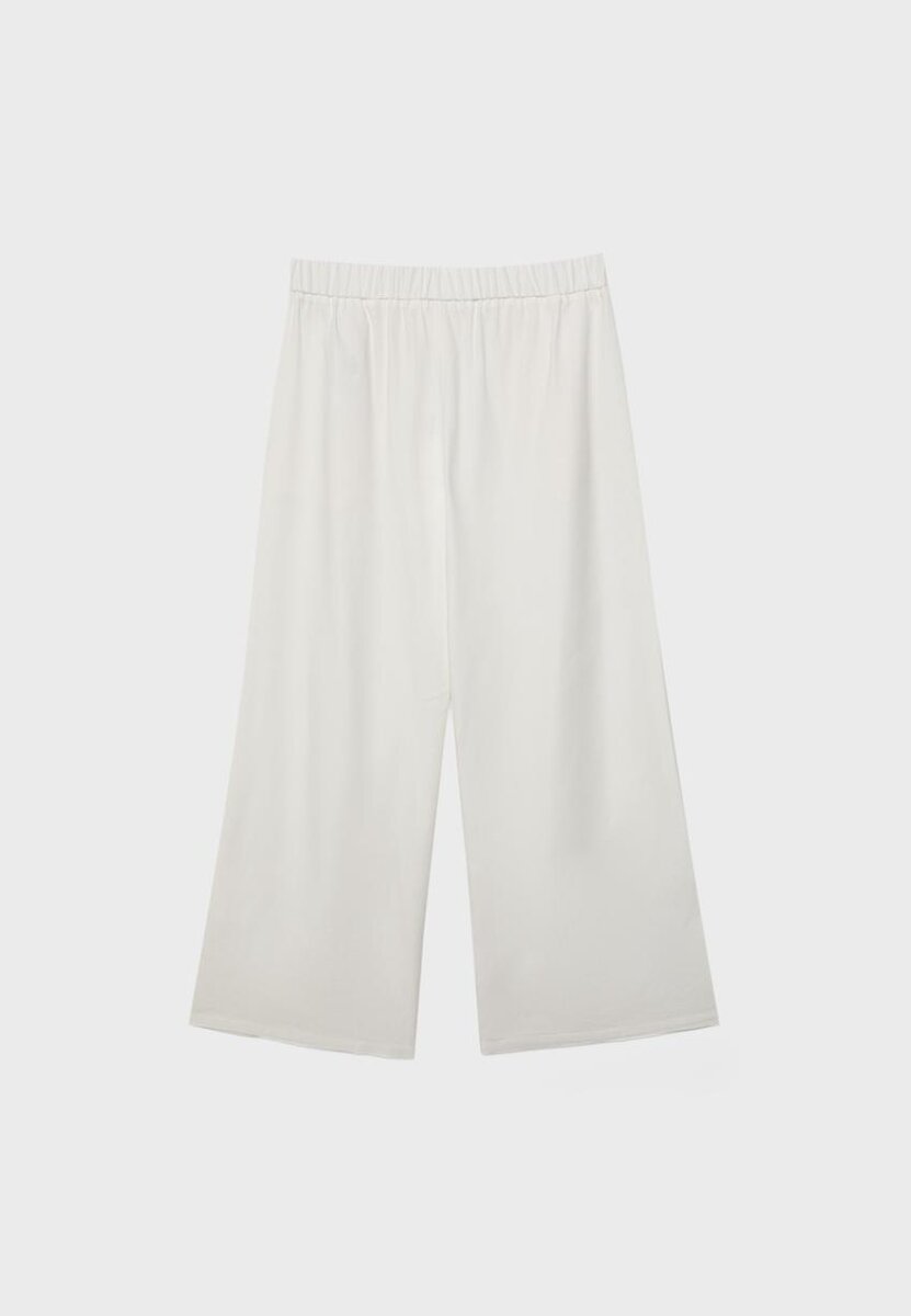 Jupe-culotte taille haute en tissu effet rustique. Avec jambes droites et Wide Legs, fermeture à deux boutons, taille élastiquée à l’arrière et poches latérales. Disponible en plusieurs couleurs.