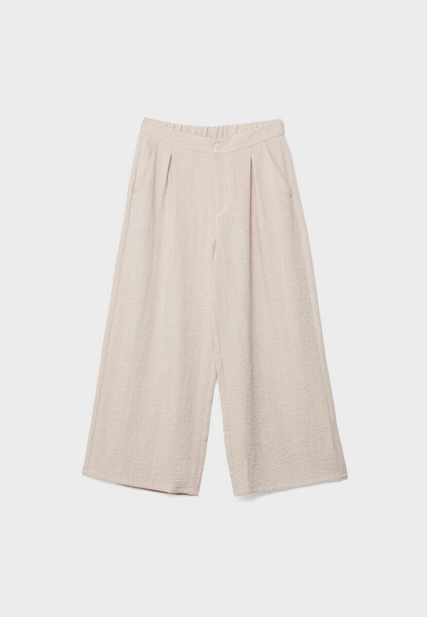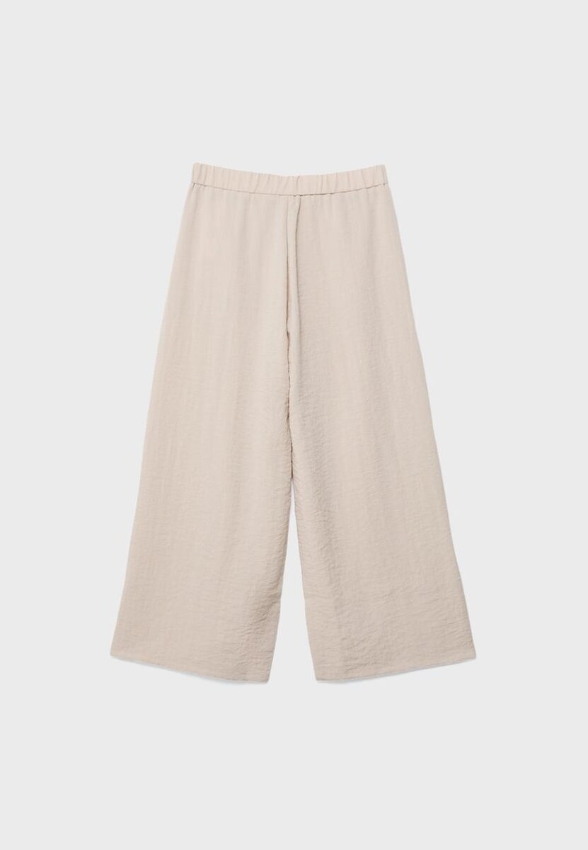 Jupe-culotte taille haute en tissu effet rustique. Avec jambes droites et Wide Leg, fermeture à double bouton, taille élastiquée à l’arrière et poches latérales. Disponible en plusieurs couleurs.
