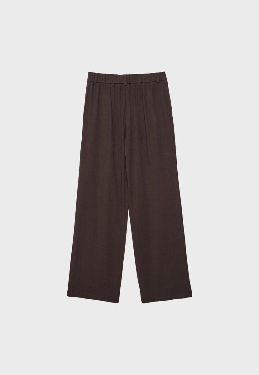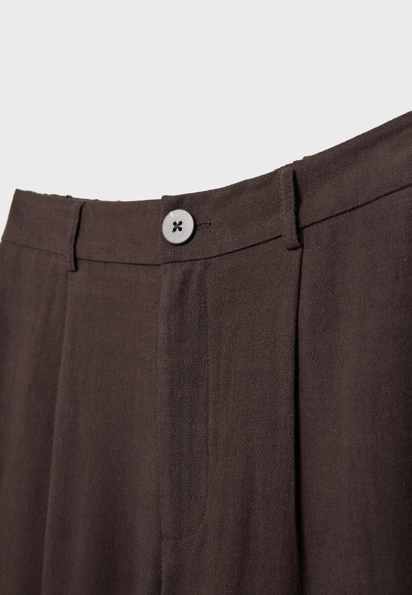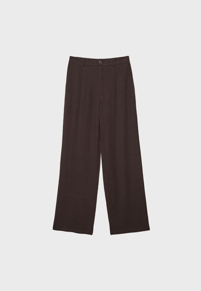 Pantalon taille haute en tissu effet lin. Doté de poches latérales et de plis sur le devant. Fermeture par bouton et fermeture éclair. Coupe droite et large. Disponible en plusieurs couleurs.