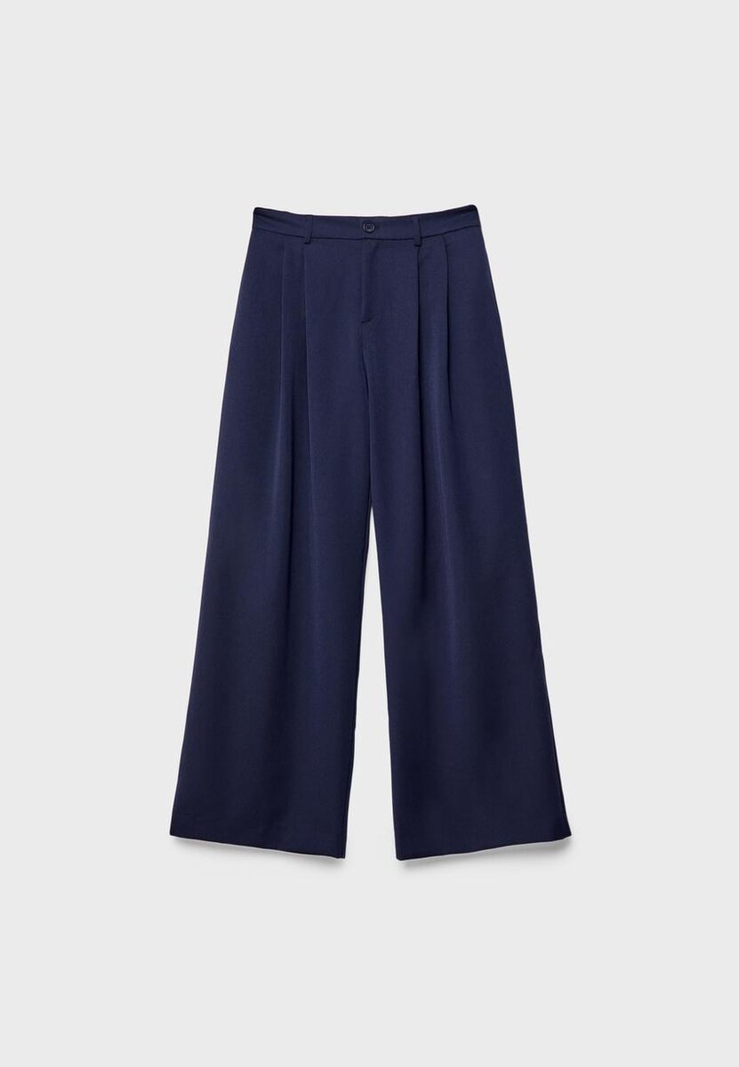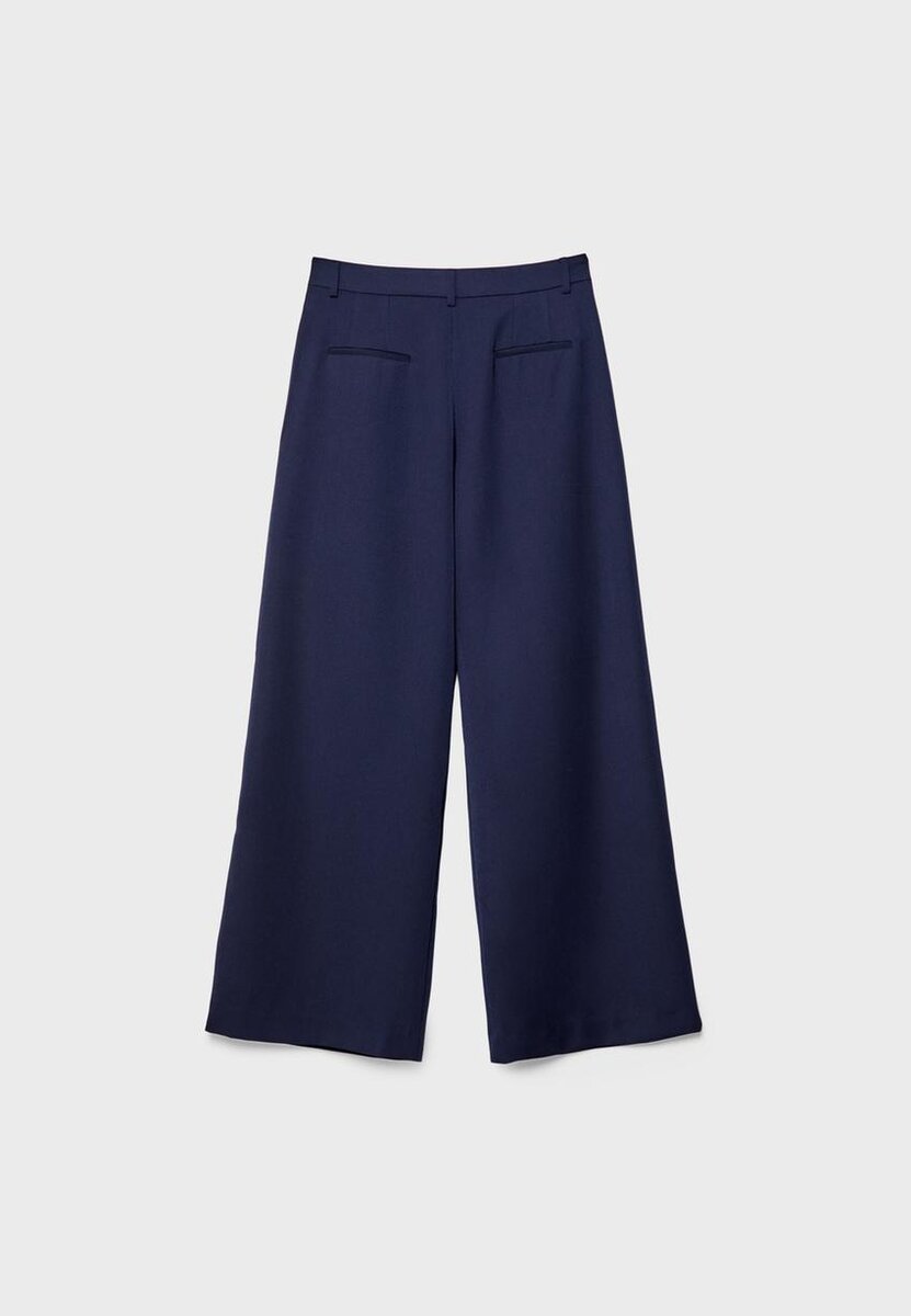 Pantalon à taille moyenne et jambes larges avec passants de ceinture. Doté de poches latérales et de fausses poches arrière passepoilées. Pinces sur le devant. Jambes larges et droites. Fermeture à glissière et boutons sur le devant.