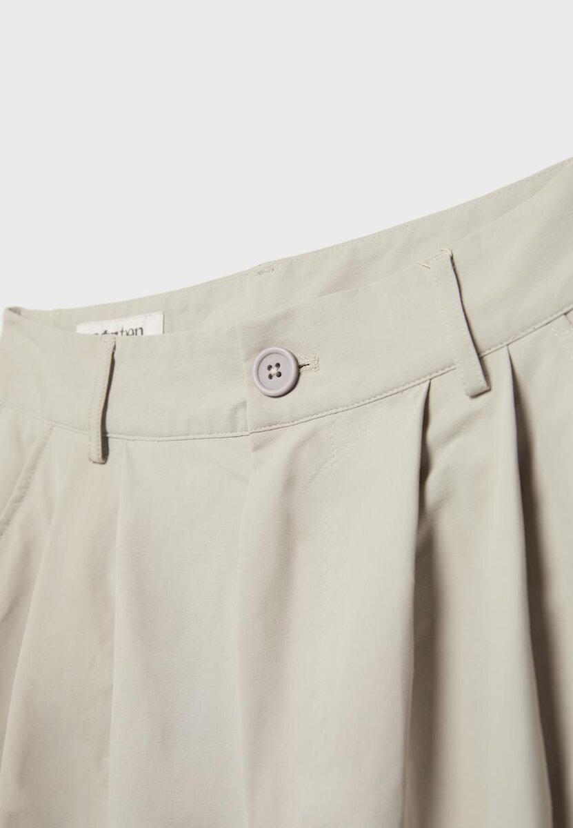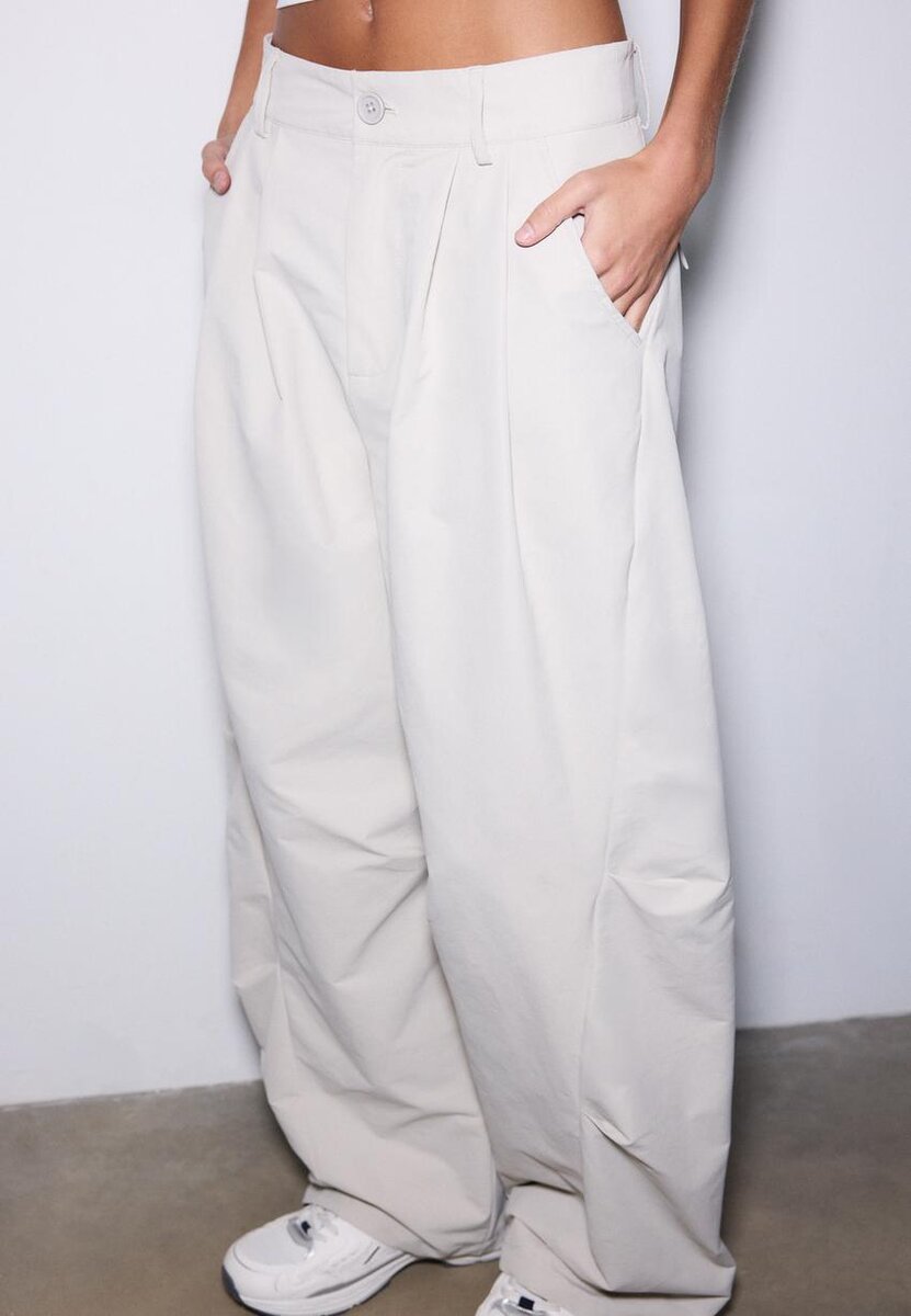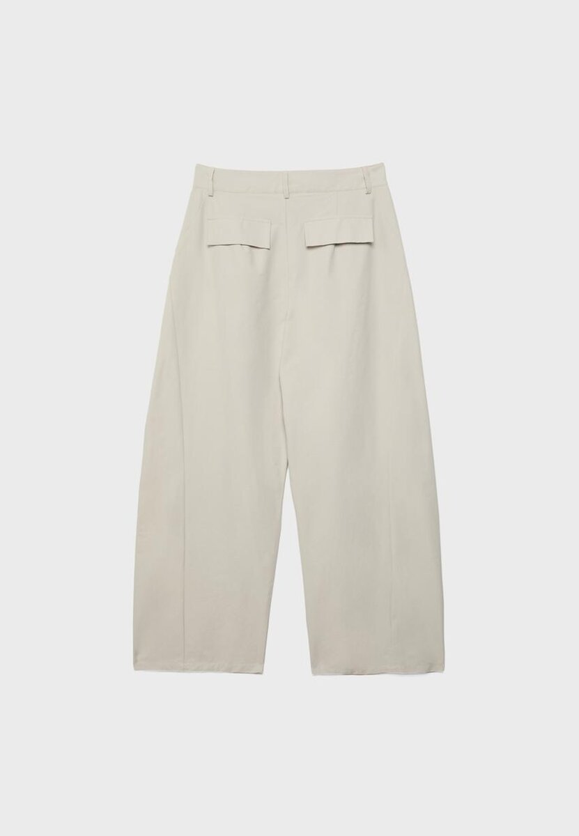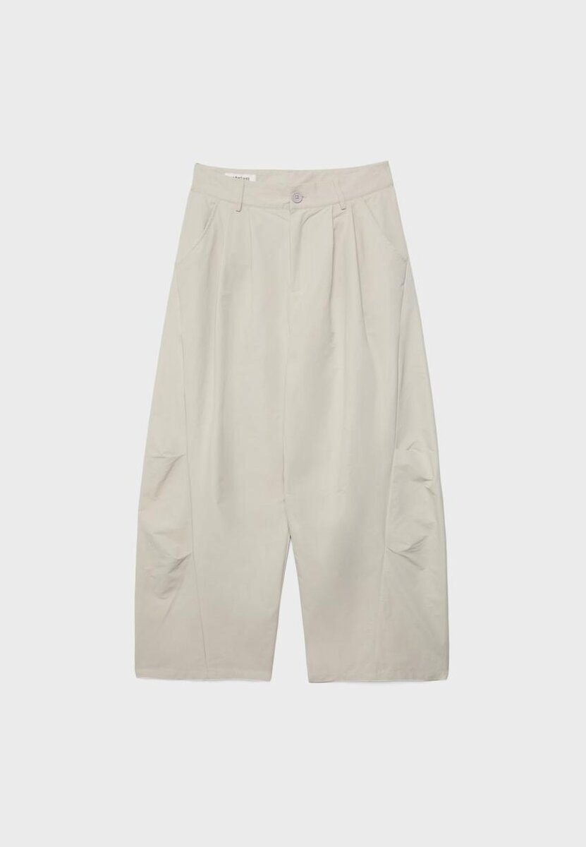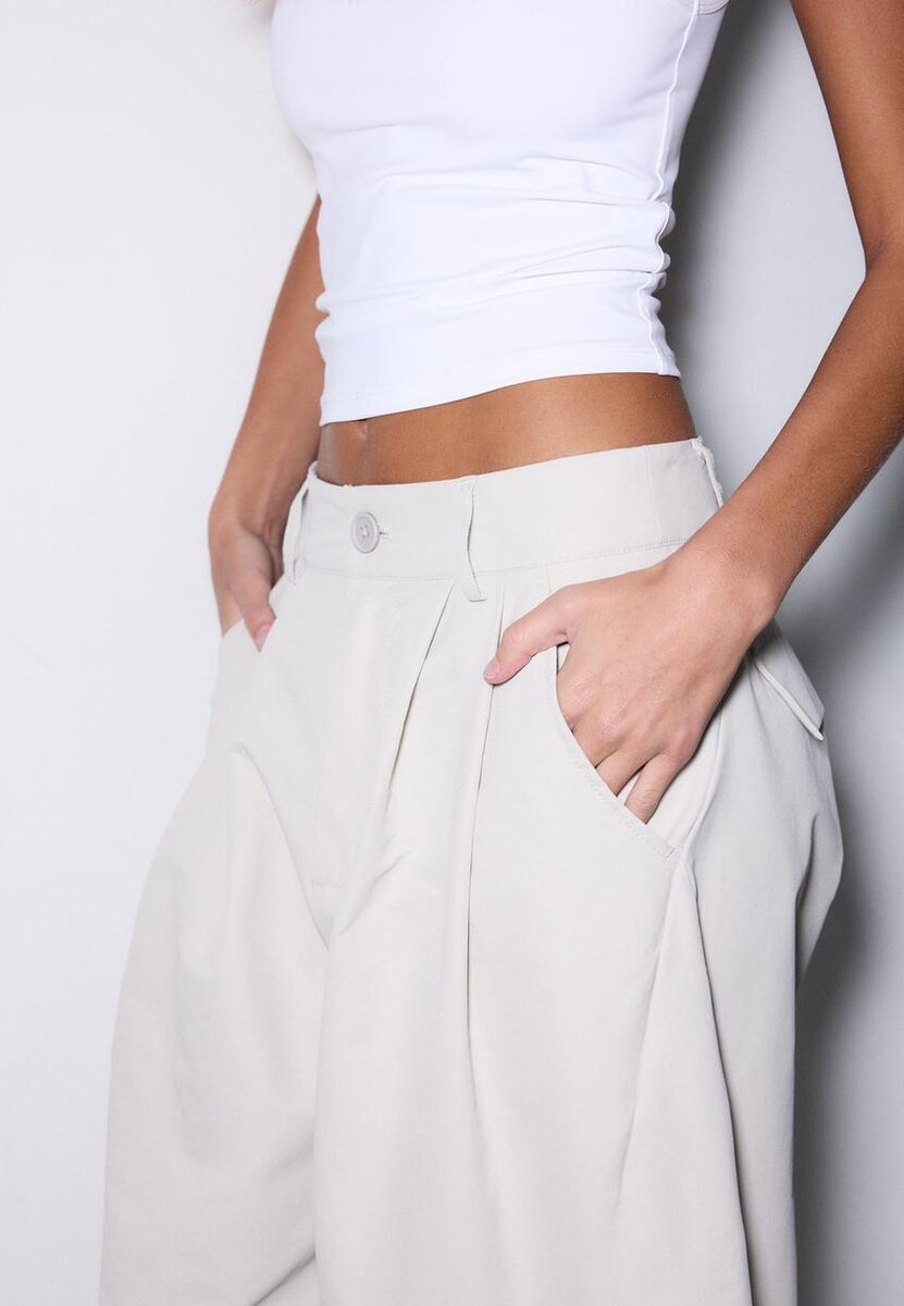 Pantalon Barrel avec passants de ceinture à la taille. Poches latérales. Fermeture à glissière sur le devant et boutons ton sur ton. Disponible en plusieurs couleurs.