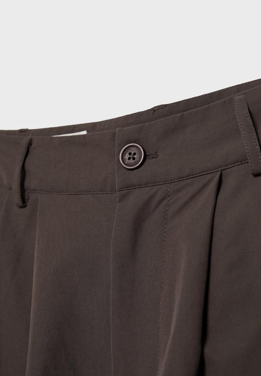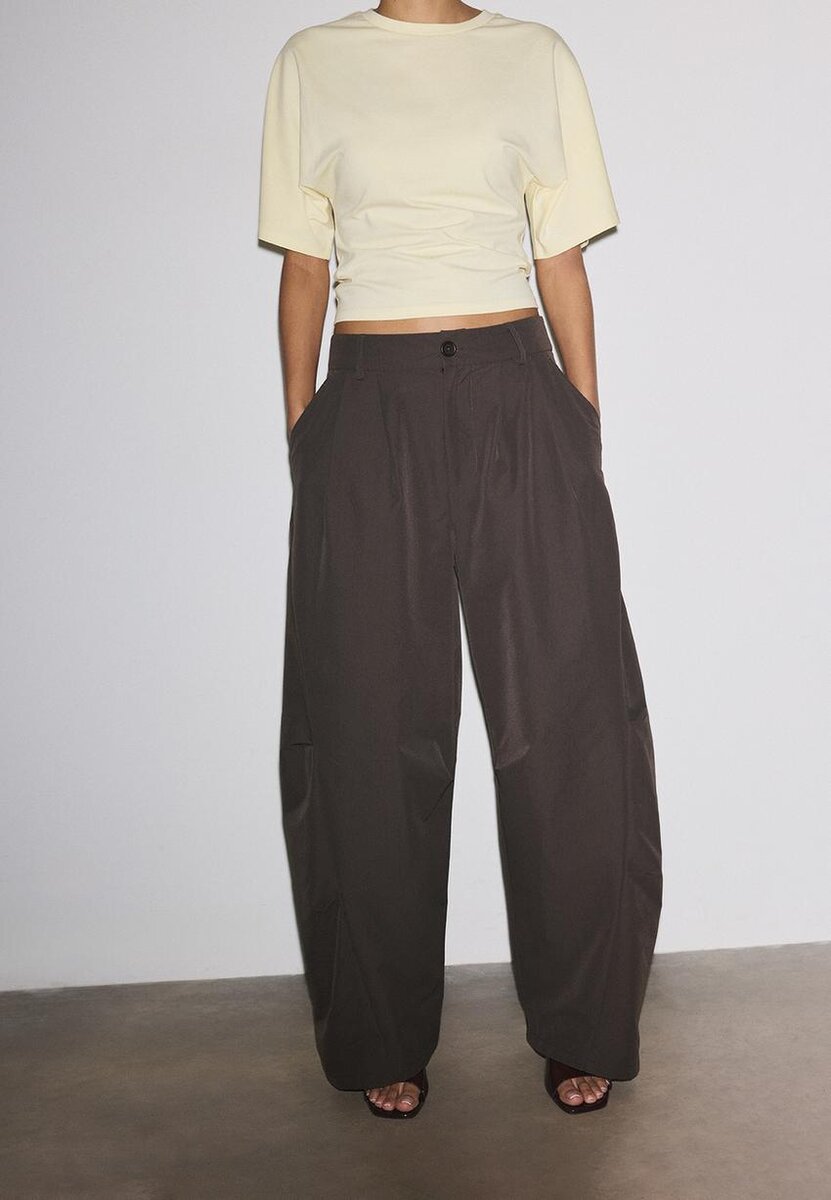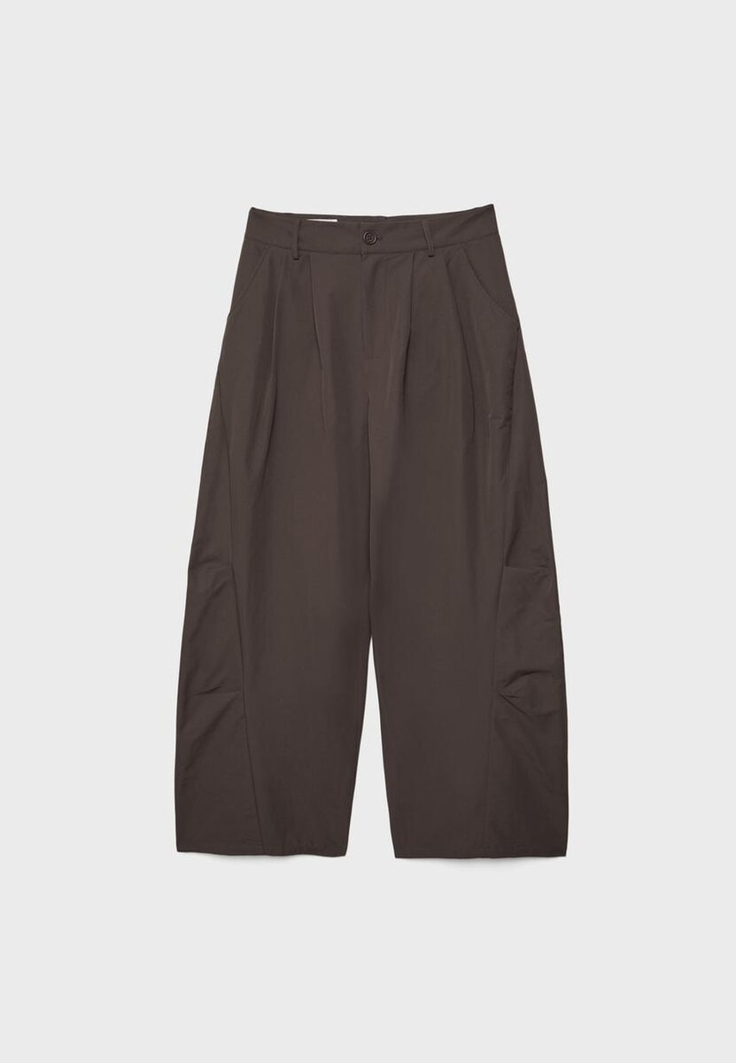 Pantalon Barrel avec passants de ceinture à la taille. Poches latérales. Fermeture à glissière sur le devant et boutons ton sur ton. Disponible en plusieurs couleurs.