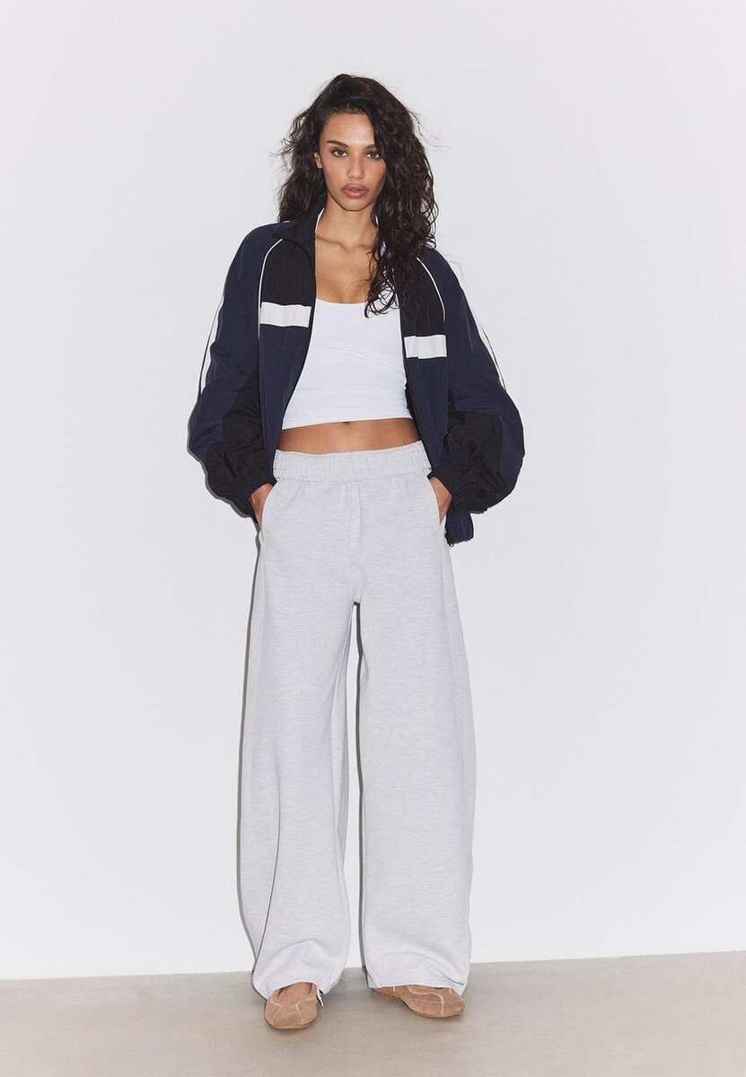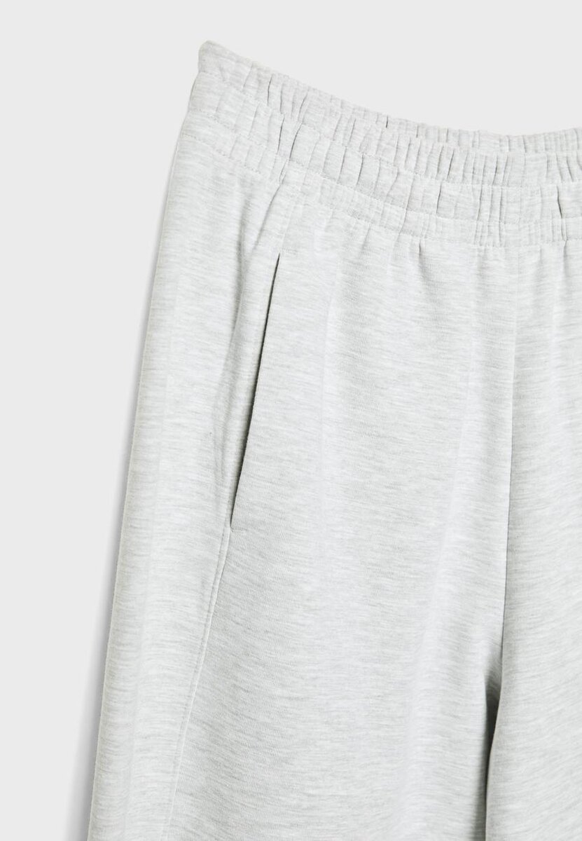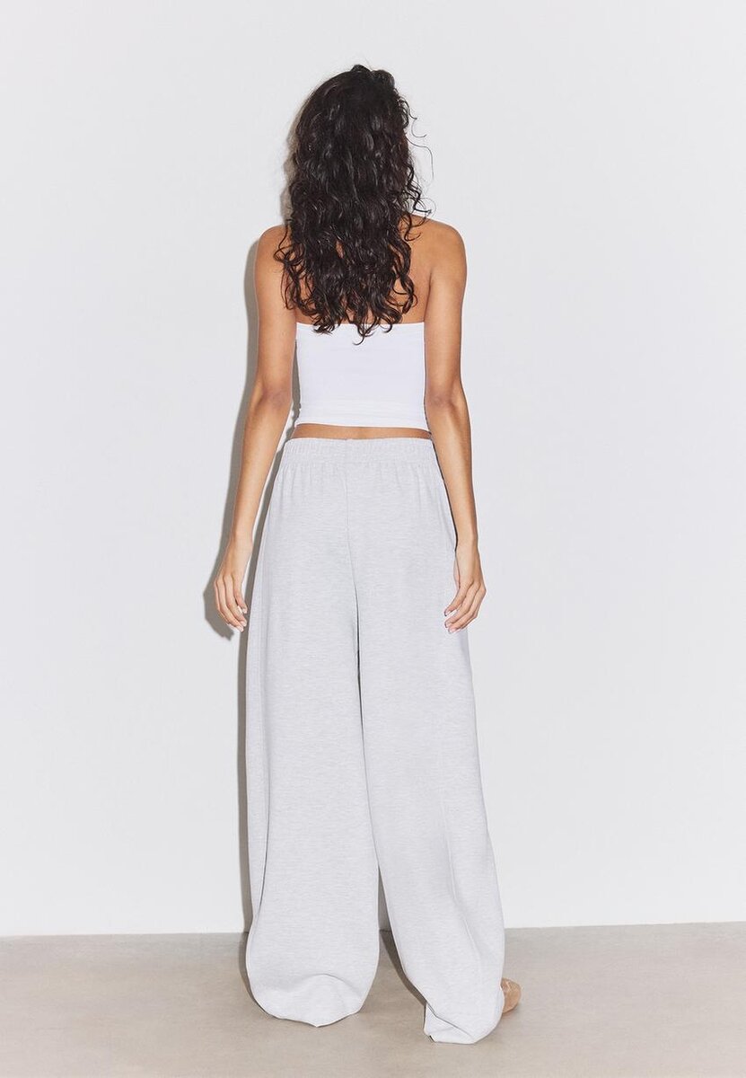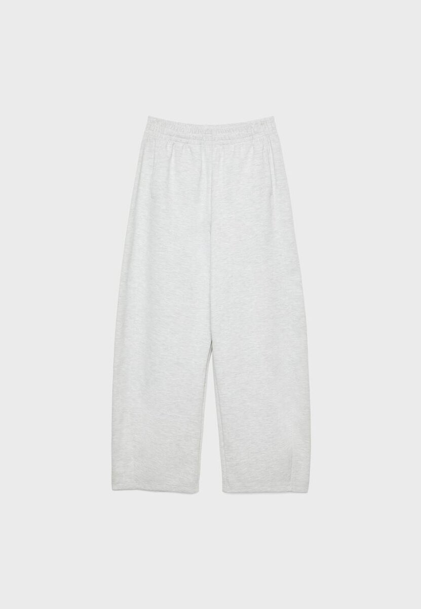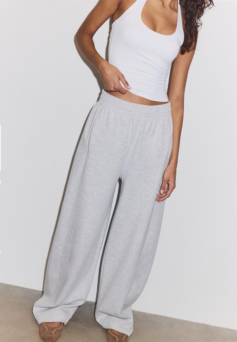 Pantalon de jogging Barrel à taille mi-haute avec taille élastiquée. Poches latérales. Jambe large bouffante. Disponible en plusieurs couleurs.