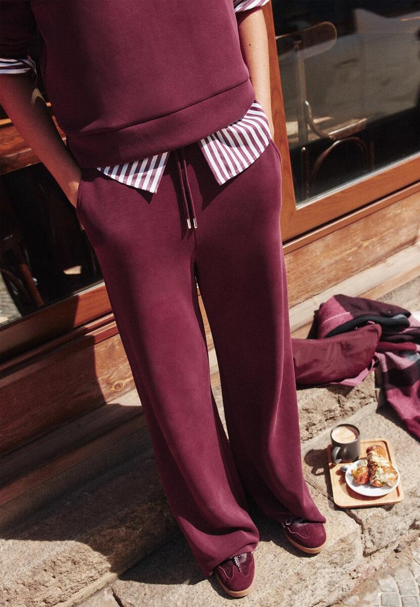 Pantalon palazzo jogger Toucher doux. Taille mi-haute et ceinture élastiquée avec cordons de serrage réglables. Poches latérales. Disponible en plusieurs couleurs.