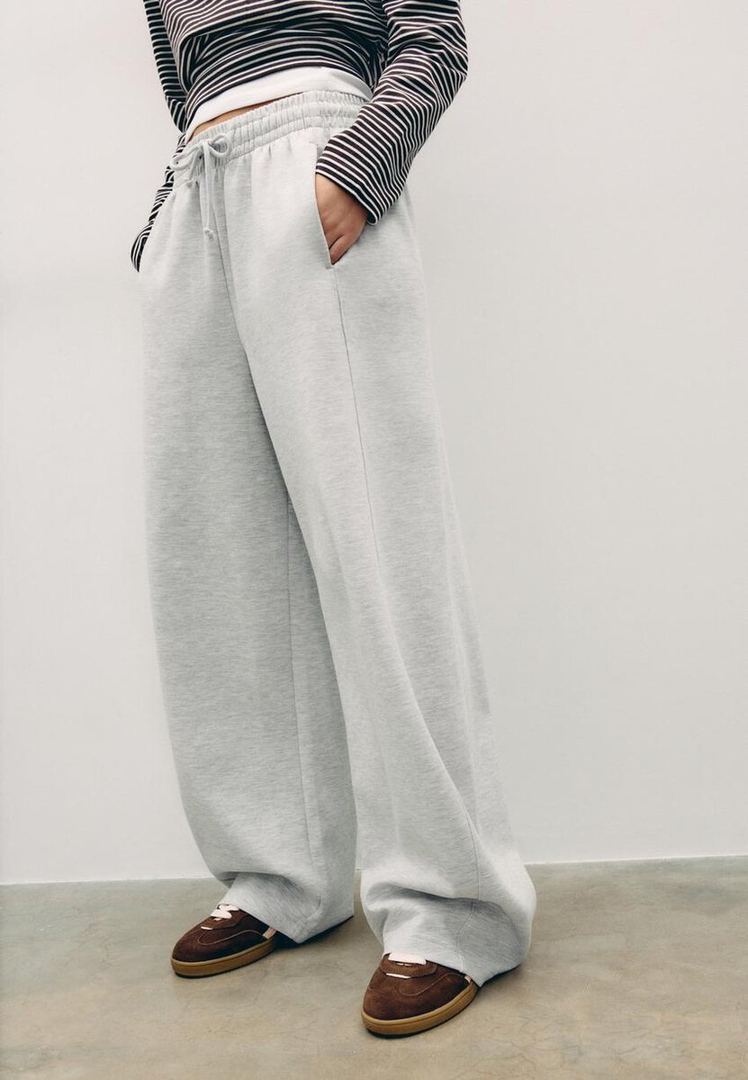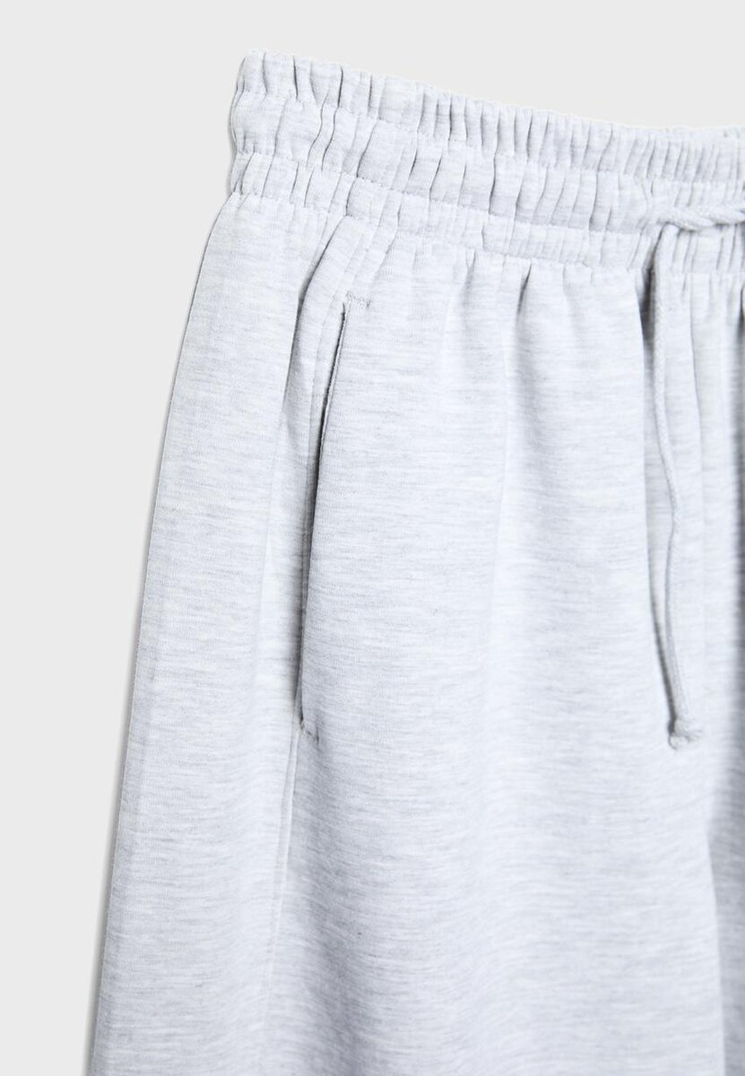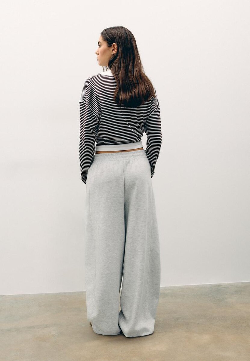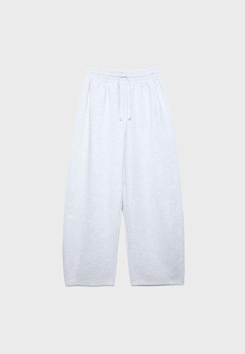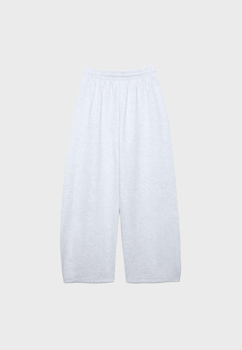 Pantalon de jogging taille mi-haute avec taille élastiquée. Poches latérales. Jambe large bouffante. Disponible en plusieurs couleurs.