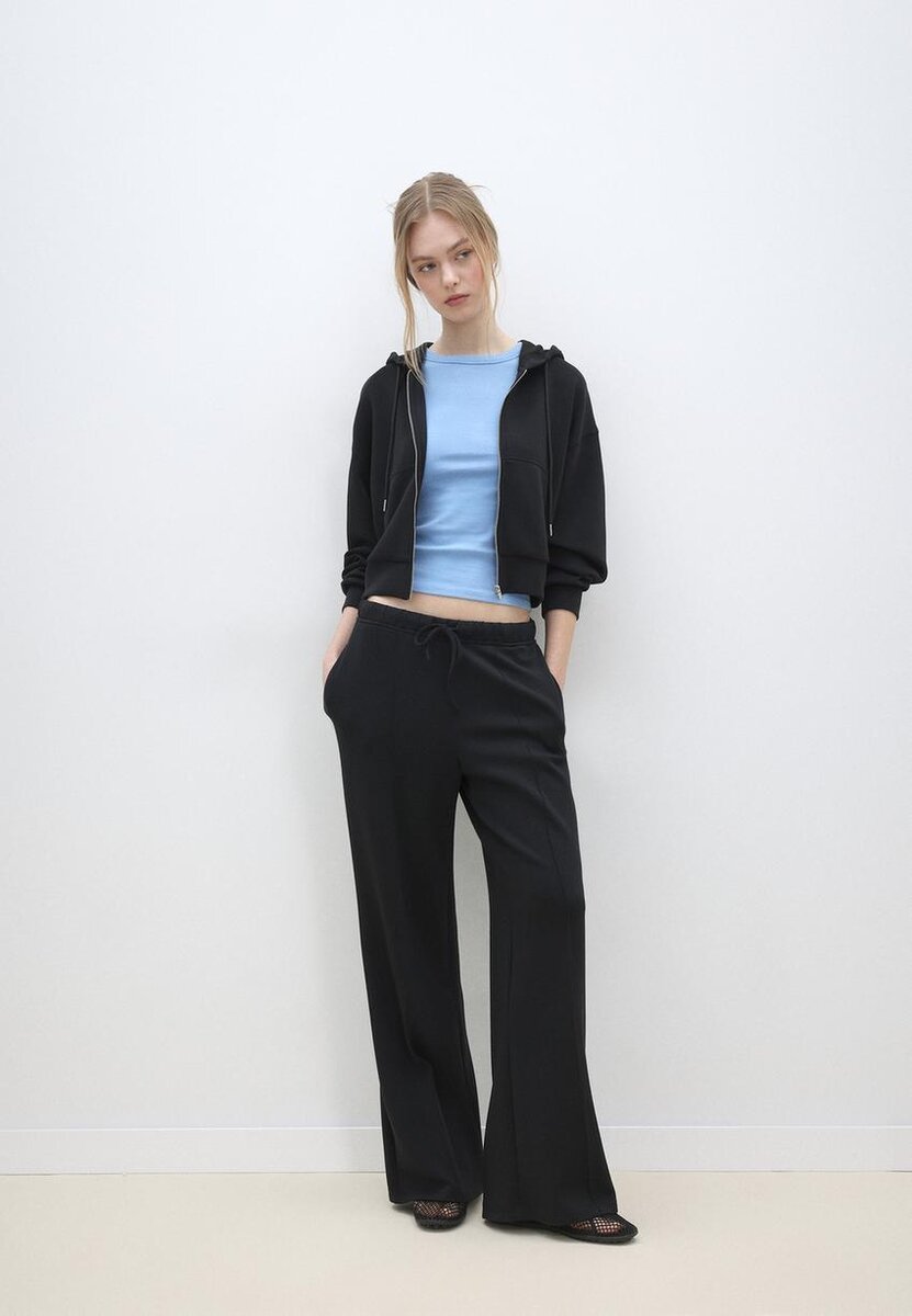 Pantalon de jogging au toucher doux. Taille mi-haute avec ceinture élastiquée et cordons de serrage ton sur ton réglables. Poches latérales. Détail de couture sur le devant. Coupe droite à jambes larges. Disponible en plusieurs couleurs.