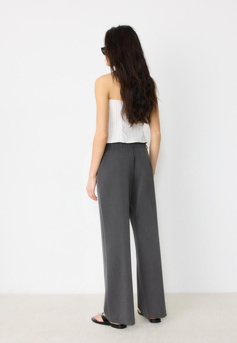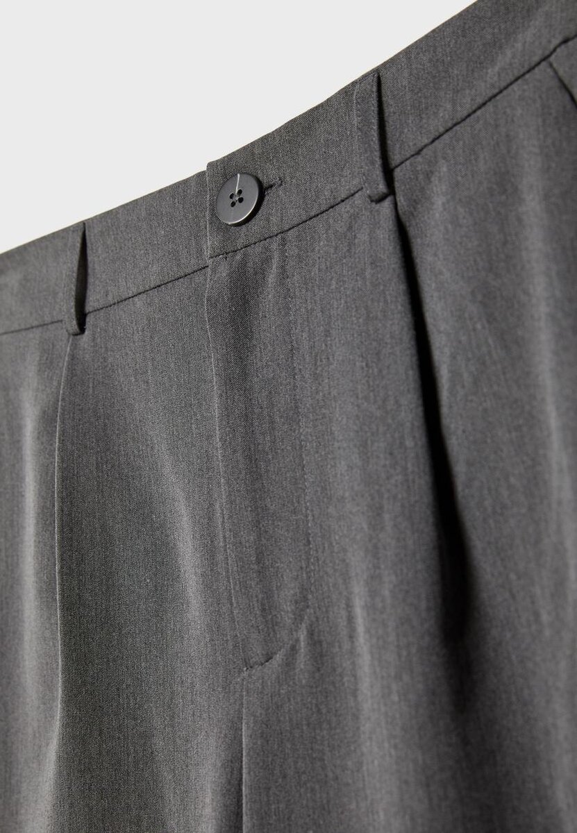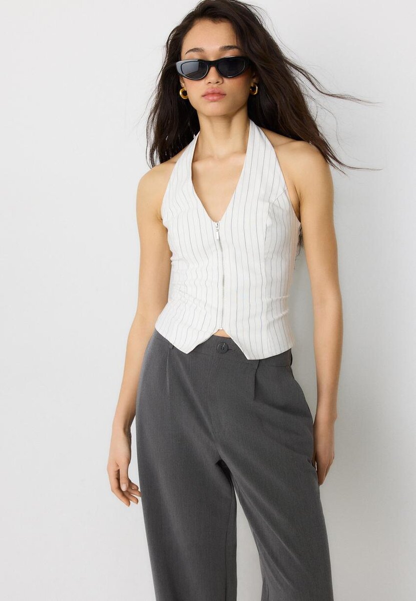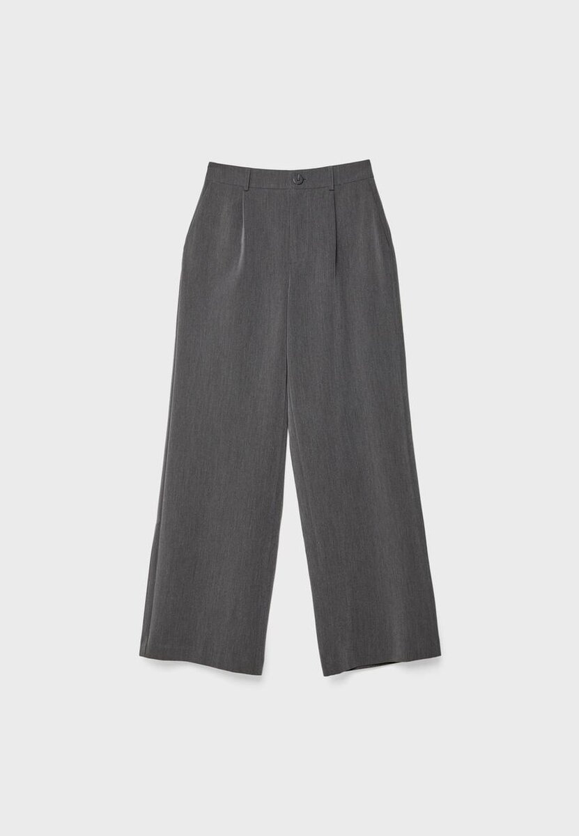 Pantalon droit à taille mi-haute, doté d’une ceinture élastiquée à l’arrière avec passants, de poches latérales, de pinces à l’avant et d’une braguette à fermeture éclair et d’une fermeture à bouton sur le haut. Disponible en plusieurs couleurs.