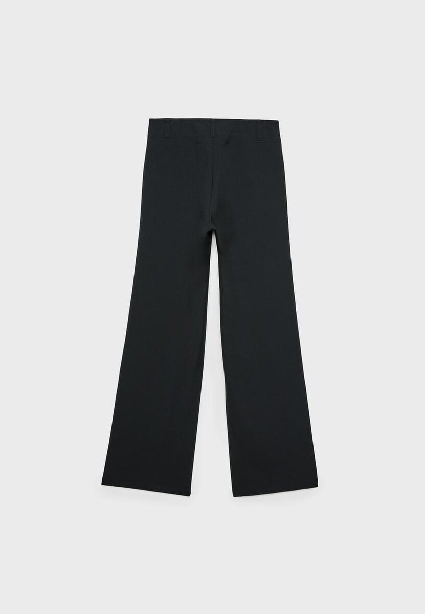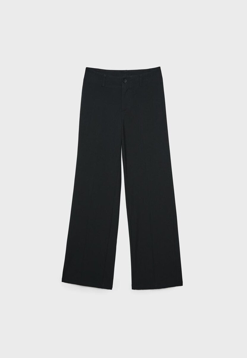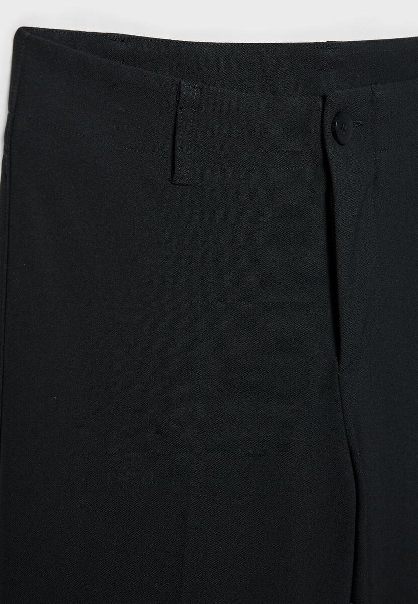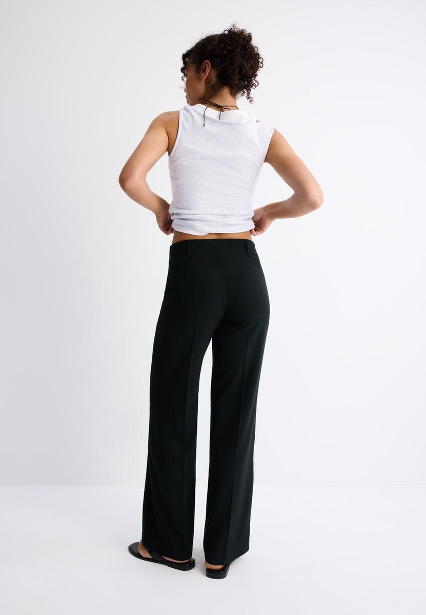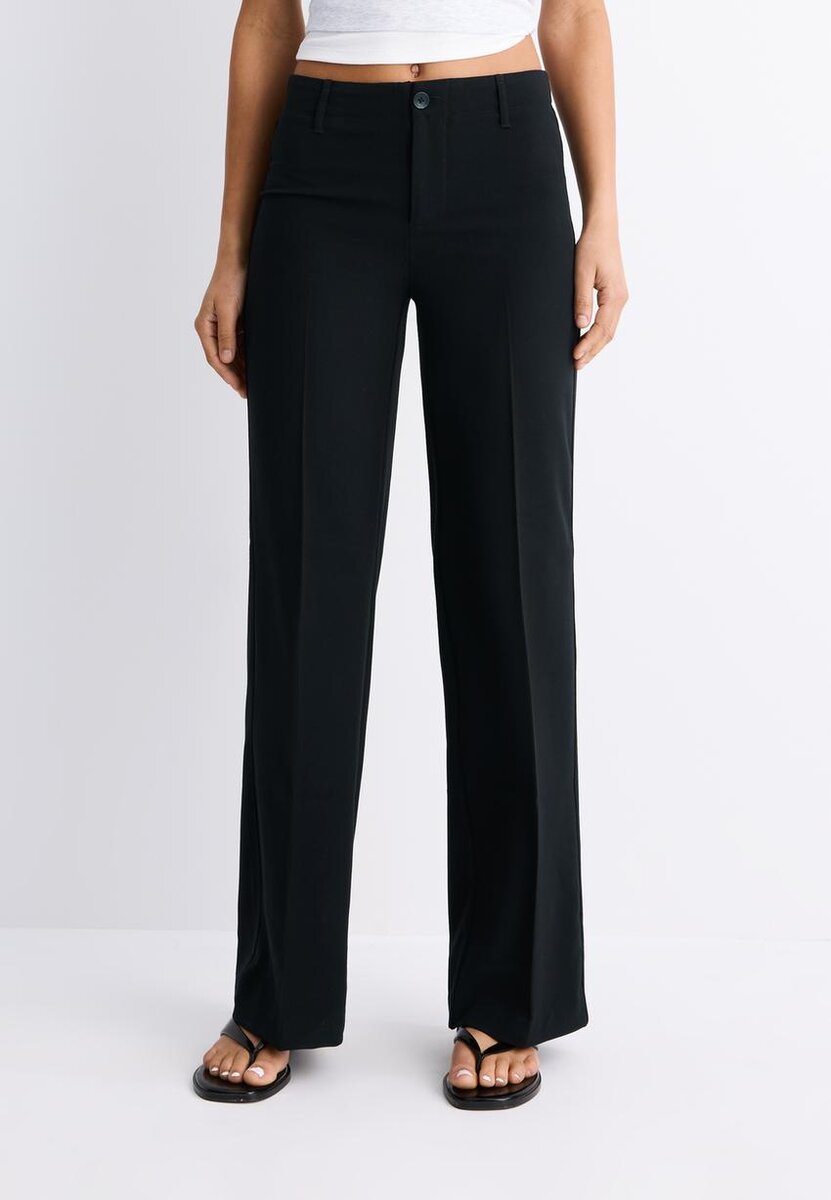 Pantalon élégant en tissu extensible. Taille mi-haute avec passants de ceinture. Coupe ajustée et droite. Fermeture à glissière et boutons sur le devant. Disponible en plusieurs couleurs.