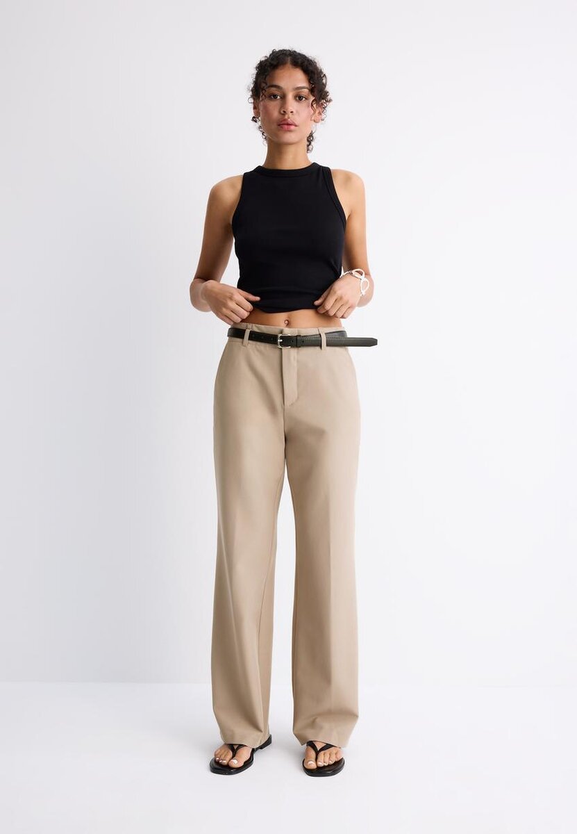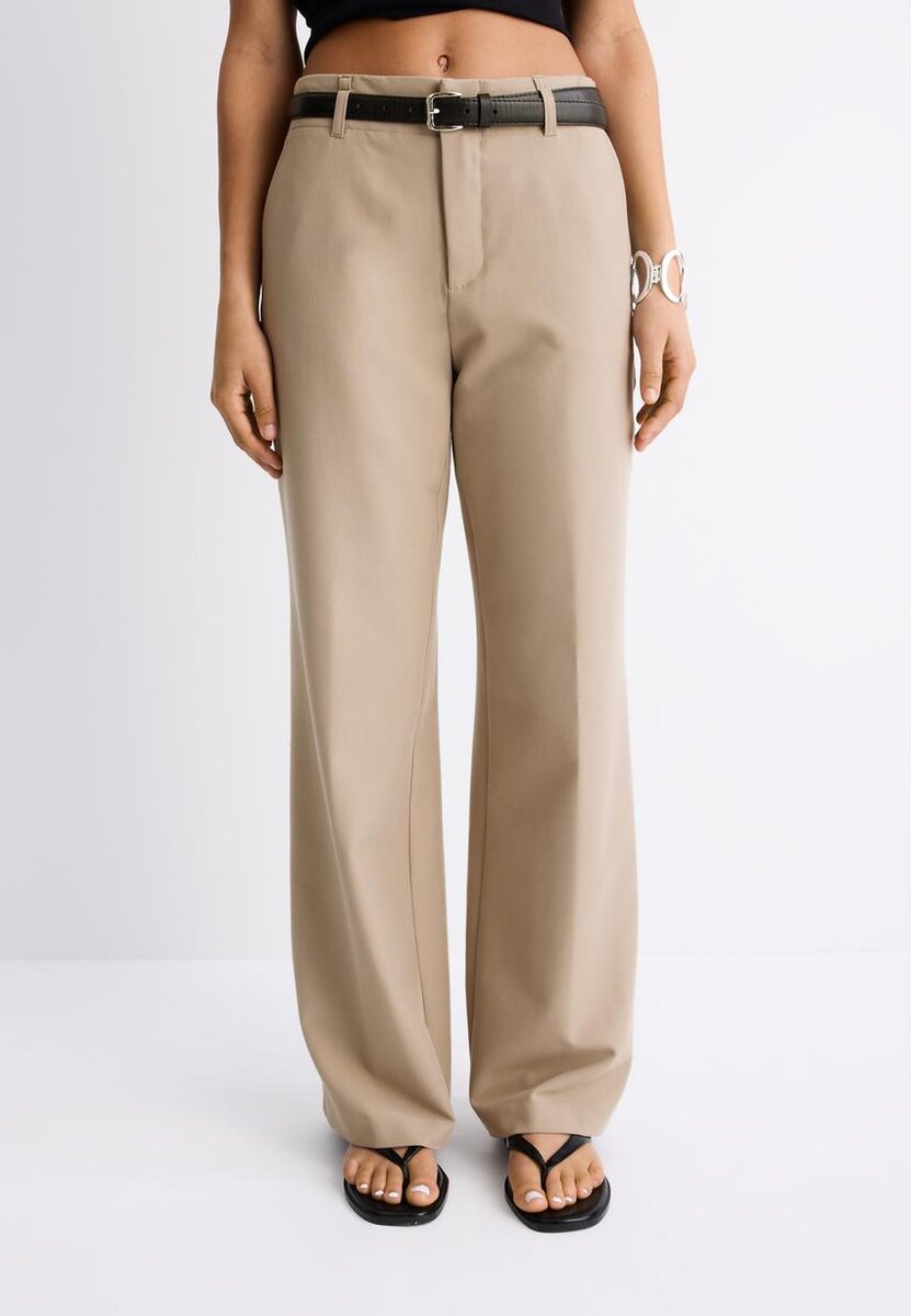Pantalon fluide à taille haute avec passants de ceinture. Doté de poches avant, de fausses poches passepoilées à l’arrière, d’une coupe à jambes droites, d’une ceinture amovible avec boucle et crochet en métal, d’une fermeture à boutons et à glissière à l’intérieur sur le devant. Disponible en plusieurs couleurs.