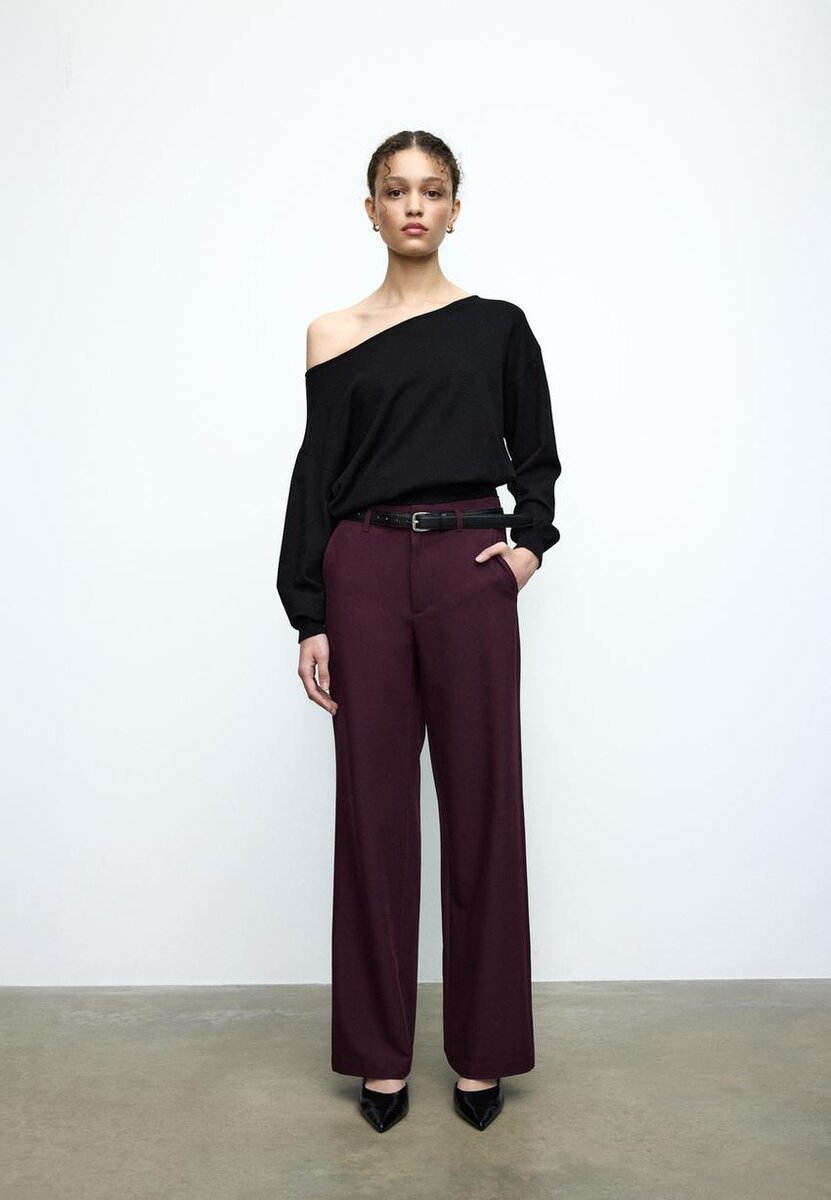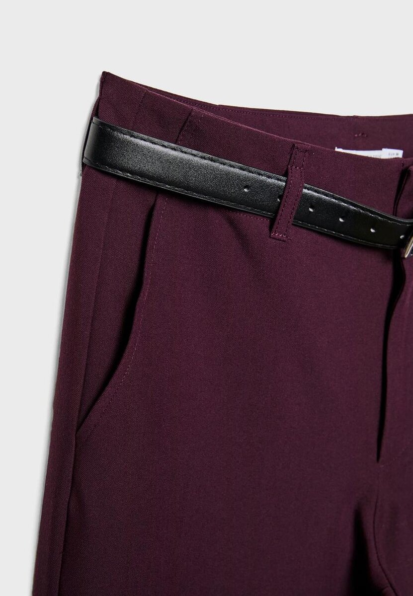 Pantalon fluide à taille haute avec passants de ceinture. Doté de poches avant, de fausses poches passepoilées à l’arrière, d’une coupe à jambes droites, d’une ceinture amovible avec boucle et crochet en métal, d’une fermeture à boutons et à glissière à l’intérieur sur le devant. Disponible en plusieurs couleurs.