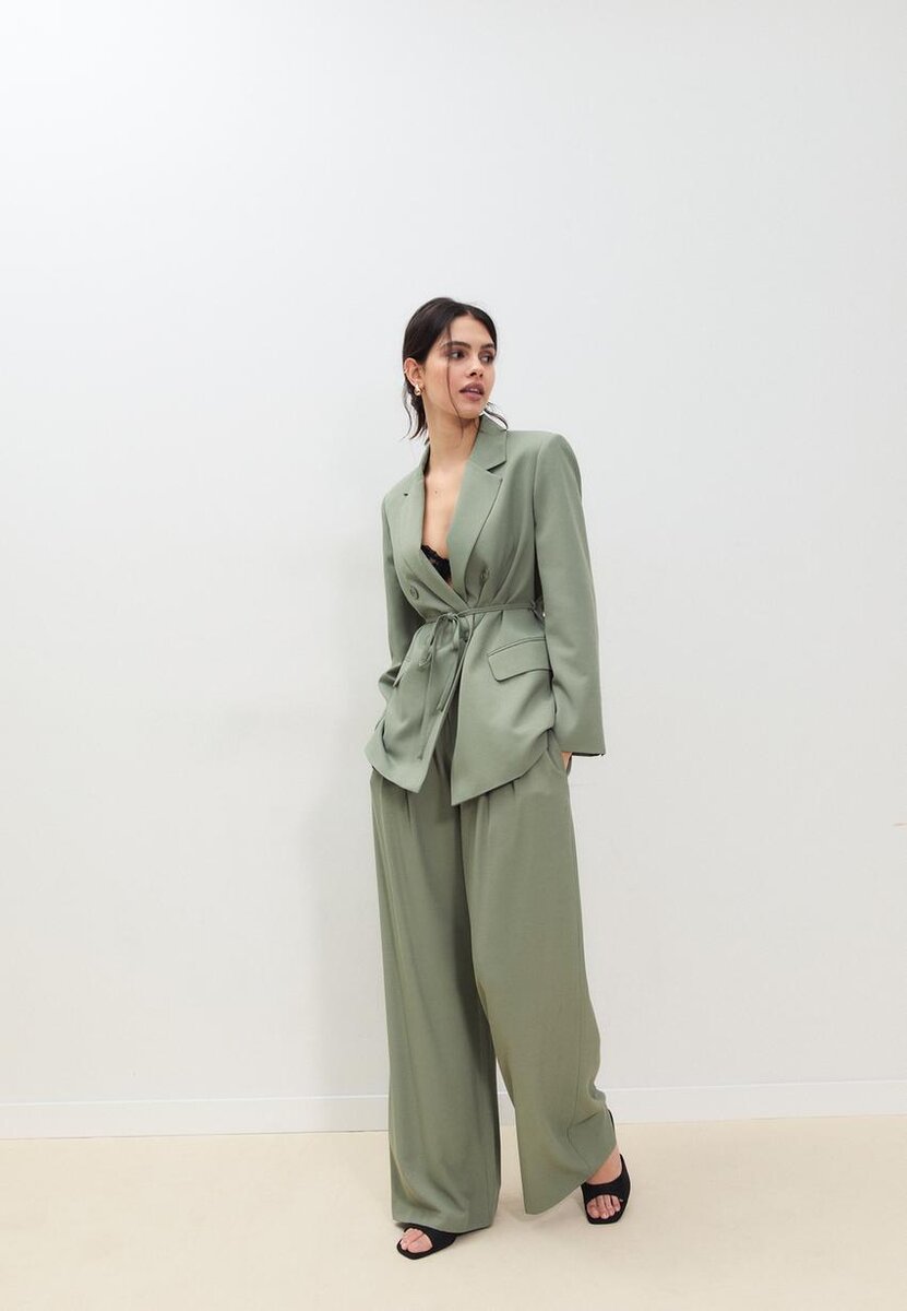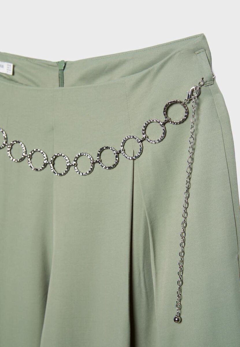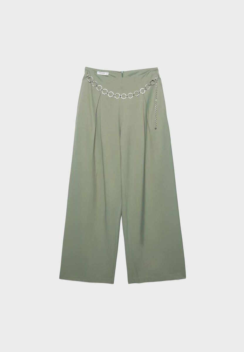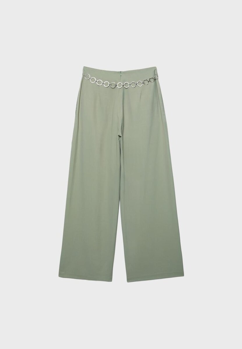 Pantalon élégant à taille mi-haute avec passants de ceinture. Avec pinces sur le devant. Coupe droite et jambes larges. Ceinture à chaîne amovible. Fermeture à glissière à l’arrière. Disponible en plusieurs couleurs.