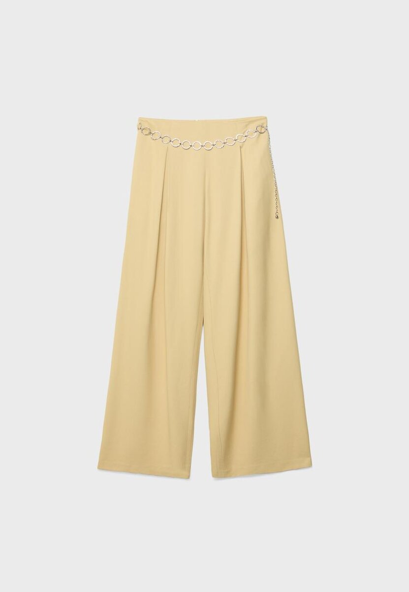 Pantalon fluide avec pinces et passants de ceinture, confectionné dans un tissu effet satin. Doté d’une coupe Wide Leg, d’une fermeture à glissière invisible à l’arrière et d’une ceinture à chaîne.