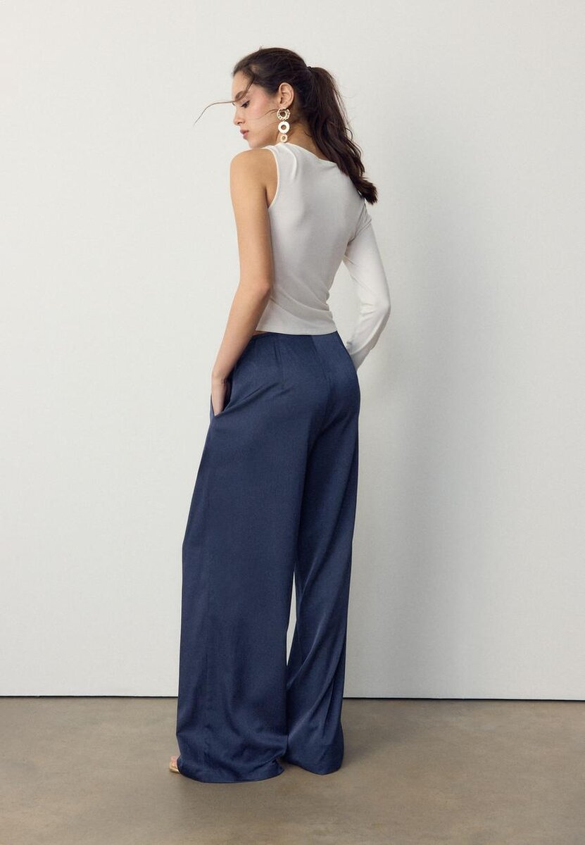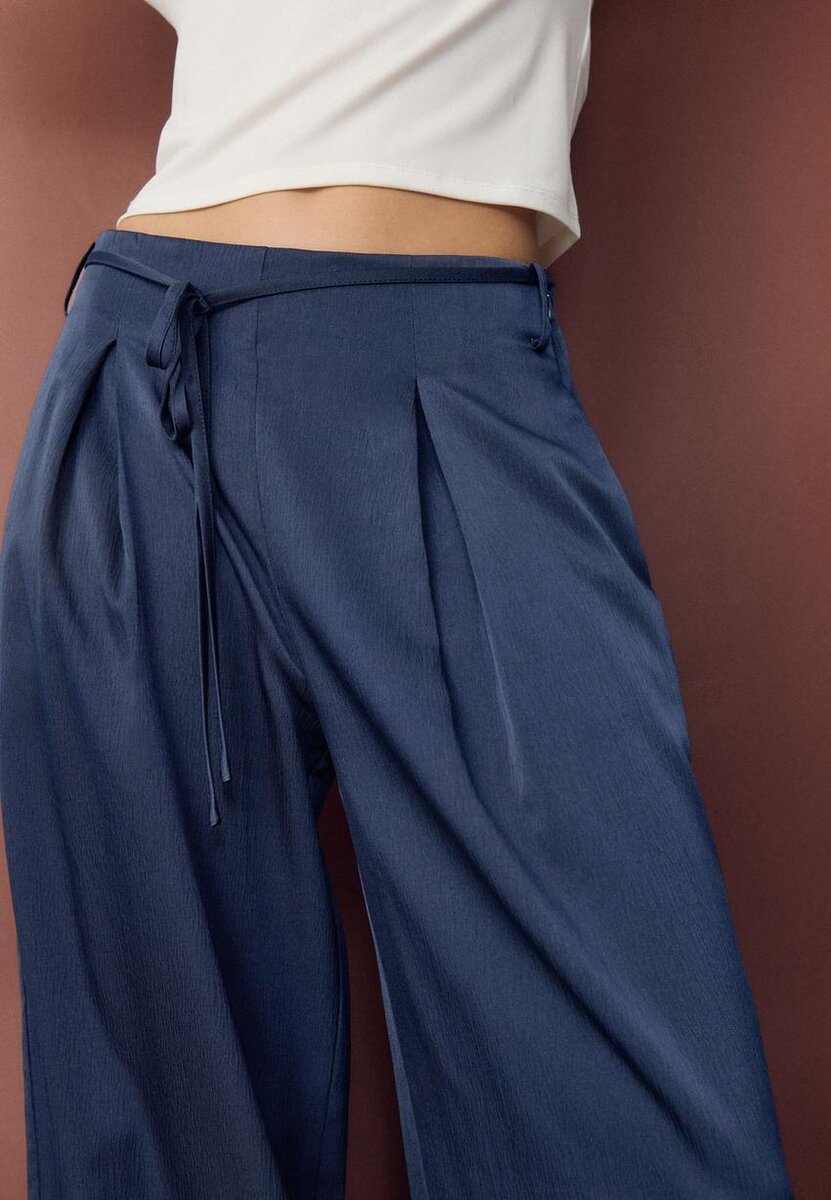 Pantalon fluide en tissu à effet froissé. Wide Leg et taille haute. Avec pinces sur le devant et ceinture assortie. Poches et fermeture à glissière latérale invisible. Disponible en plusieurs couleurs.