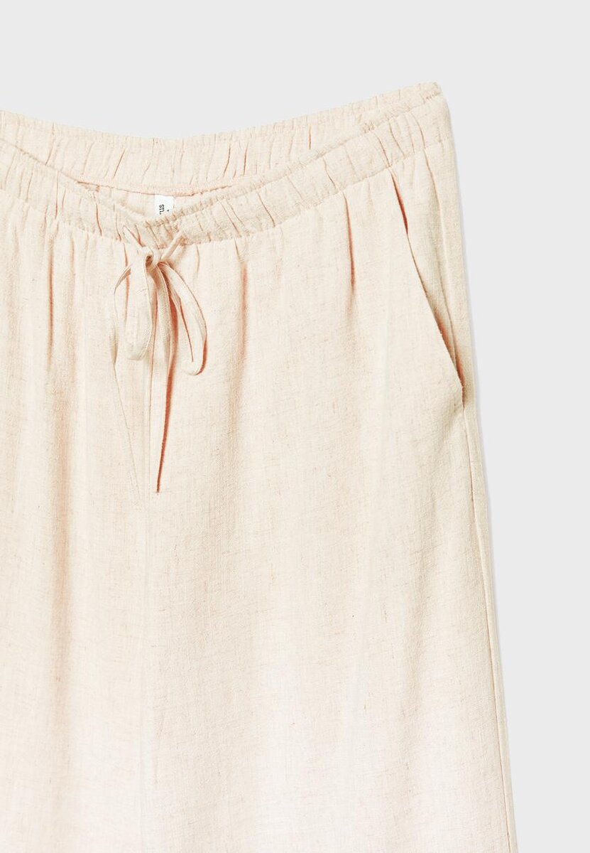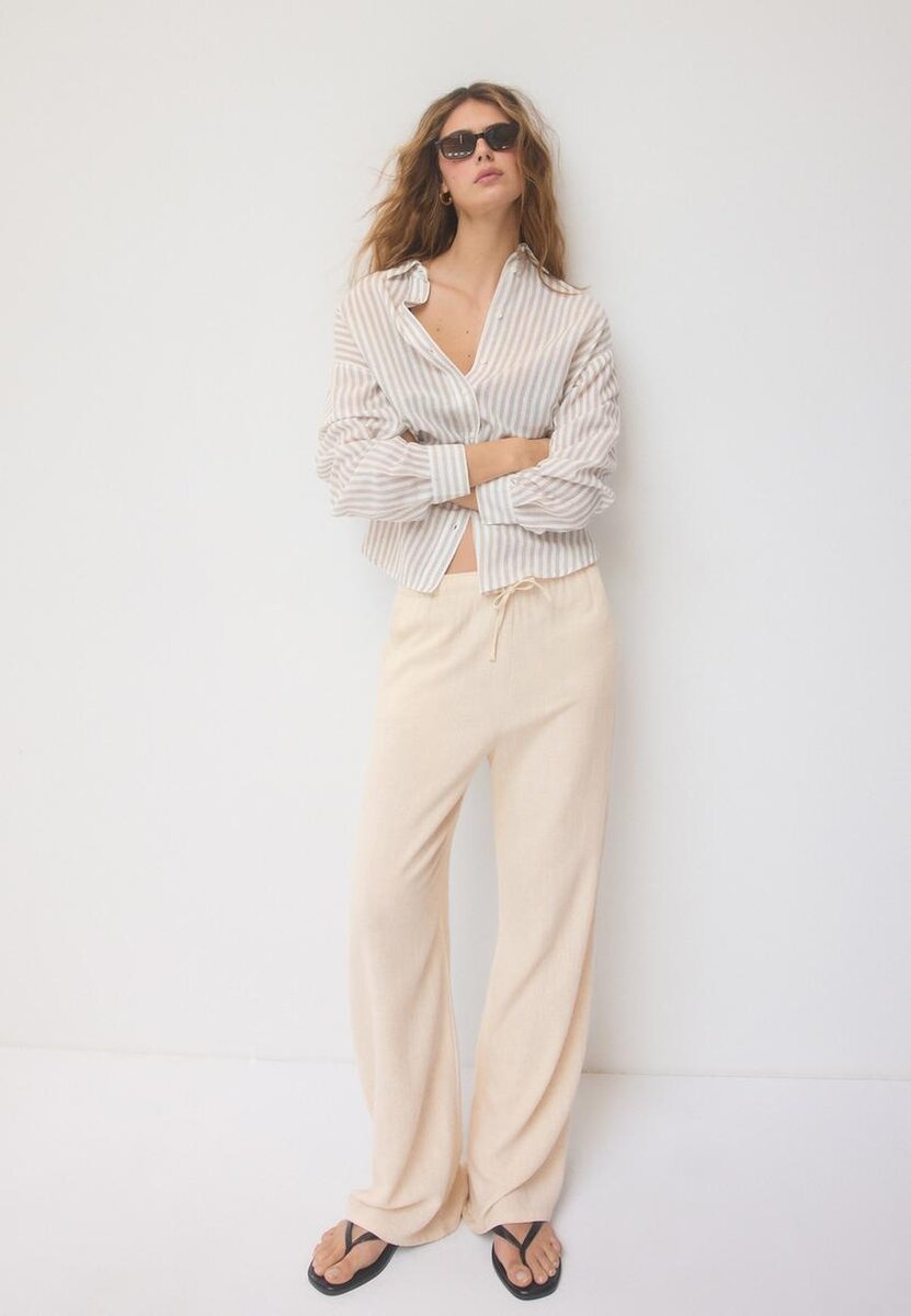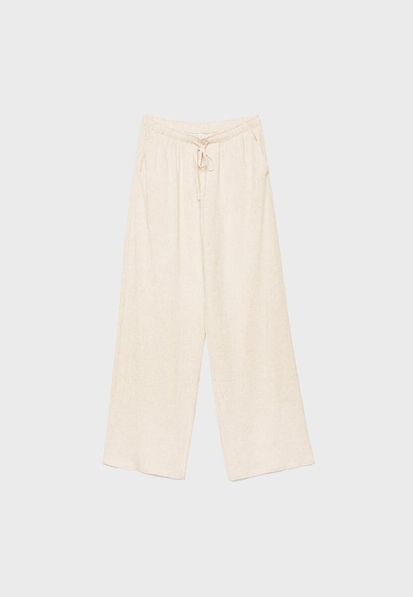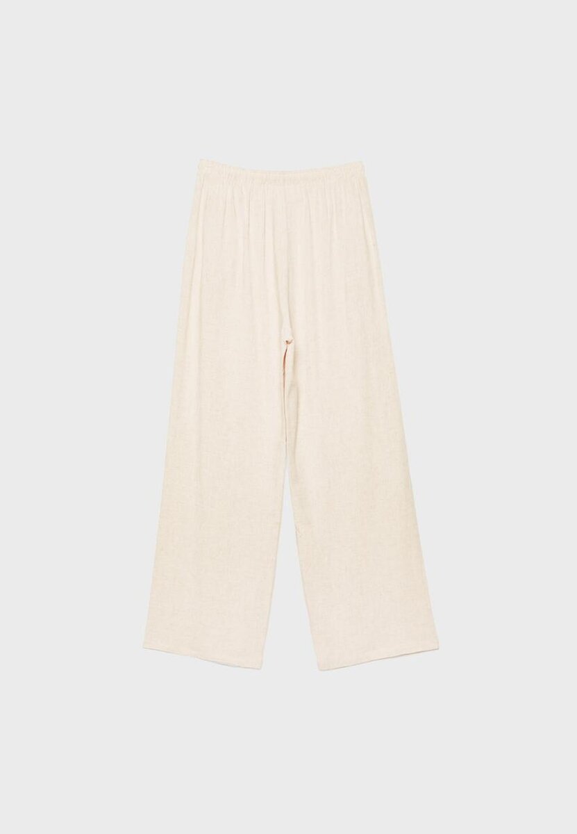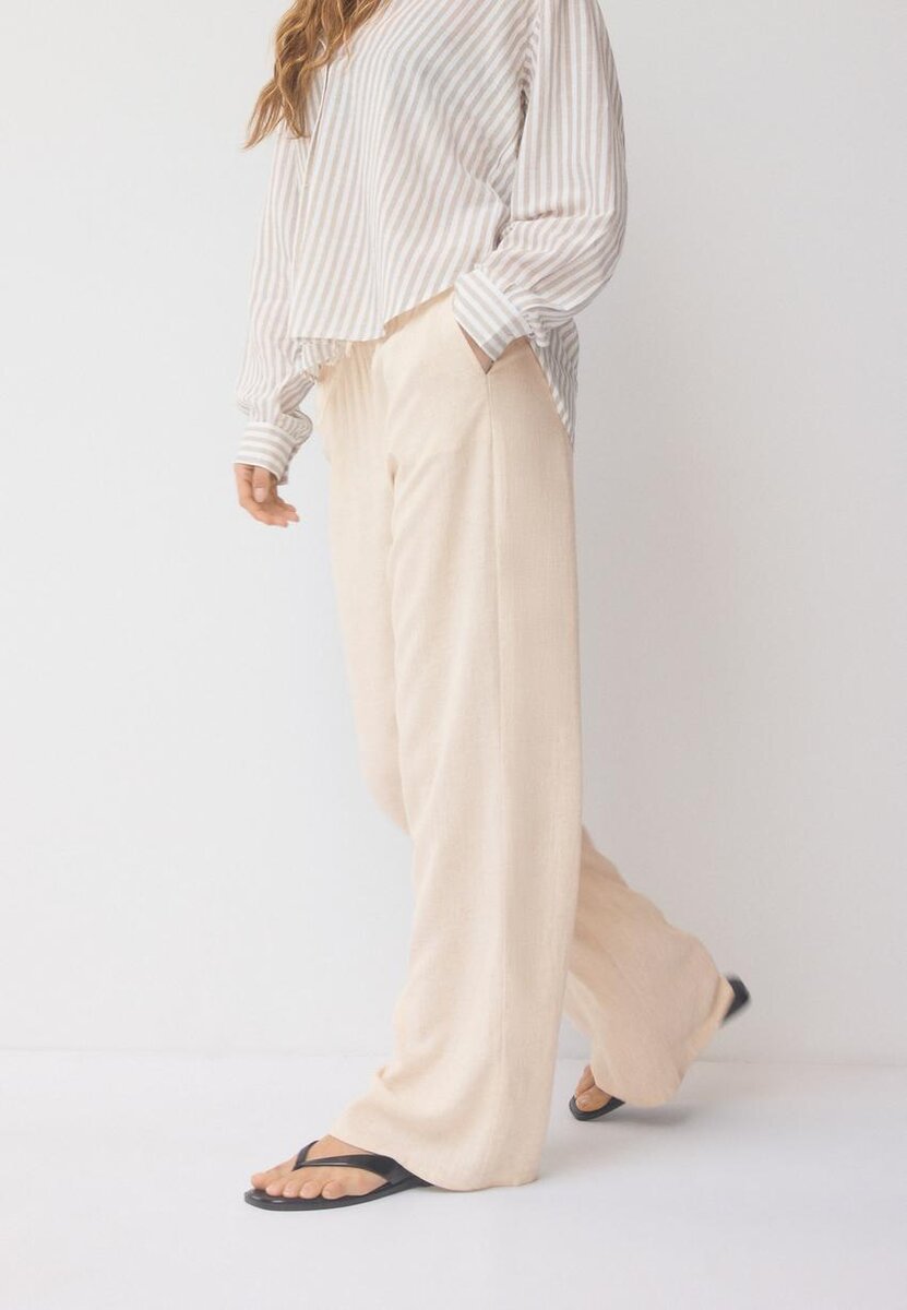 Pantalon taille haute en tissu effet lin. Doté de poches latérales et de plis sur le devant. Fermeture à boutons et à glissière.