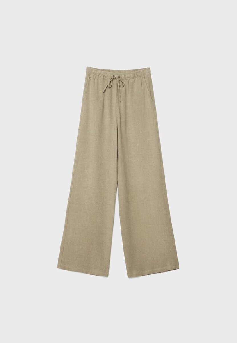 Pantalon taille haute en tissu effet lin. Doté de poches latérales et de plis sur le devant. Fermeture par bouton et fermeture éclair. Coupe large et droite. Disponible en plusieurs couleurs.