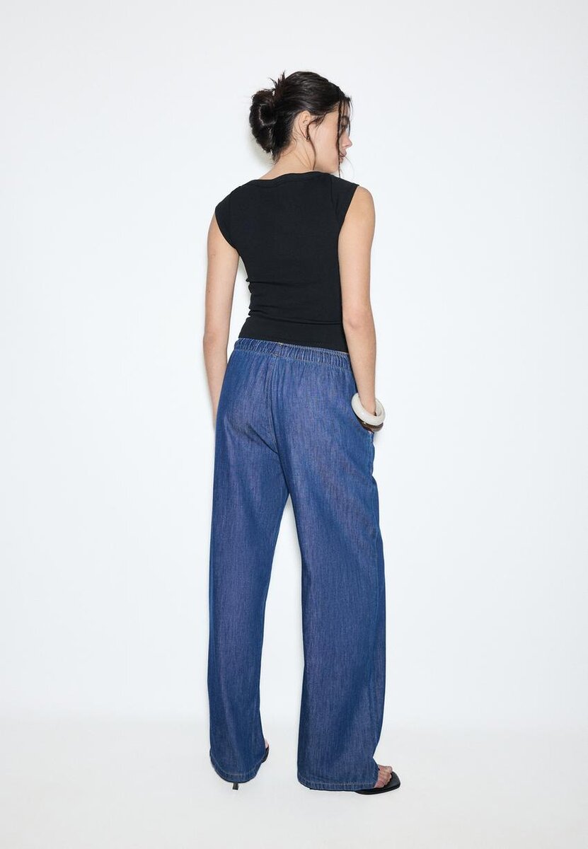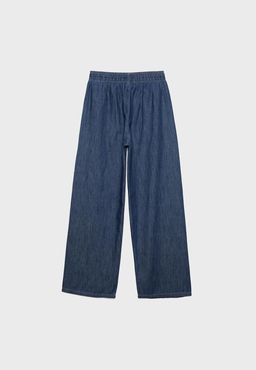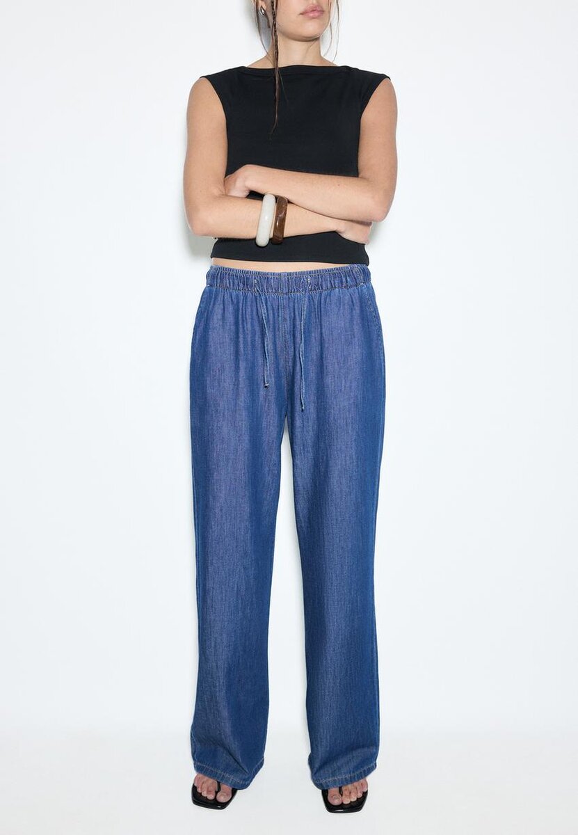 Pantalon en denim fluide à taille mi-haute et ceinture élastique ajustable avec cordons de serrage assortis. Poches latérales. Coupe large et droite. Disponible en plusieurs couleurs.