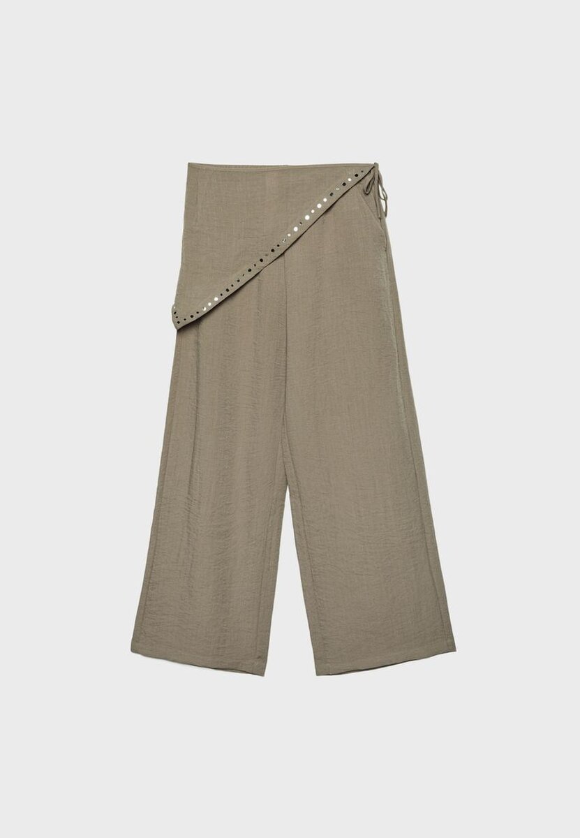Pantalon fluide taille haute avec une ceinture élastique. Poches latérales. Coupe large à jambes droites. Avec un foulard amovible. Disponible en plusieurs couleurs.
