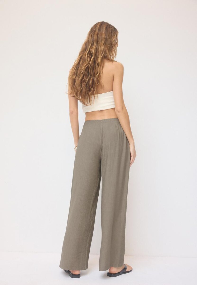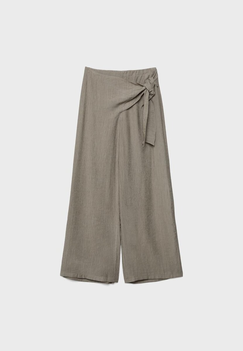 Pantalon fluide de style sarong à taille mi-haute, avec jambes droites et Wide Leg. Doté d’une fermeture à glissière latérale invisible et d’un nœud sur le devant. Disponible en plusieurs couleurs.