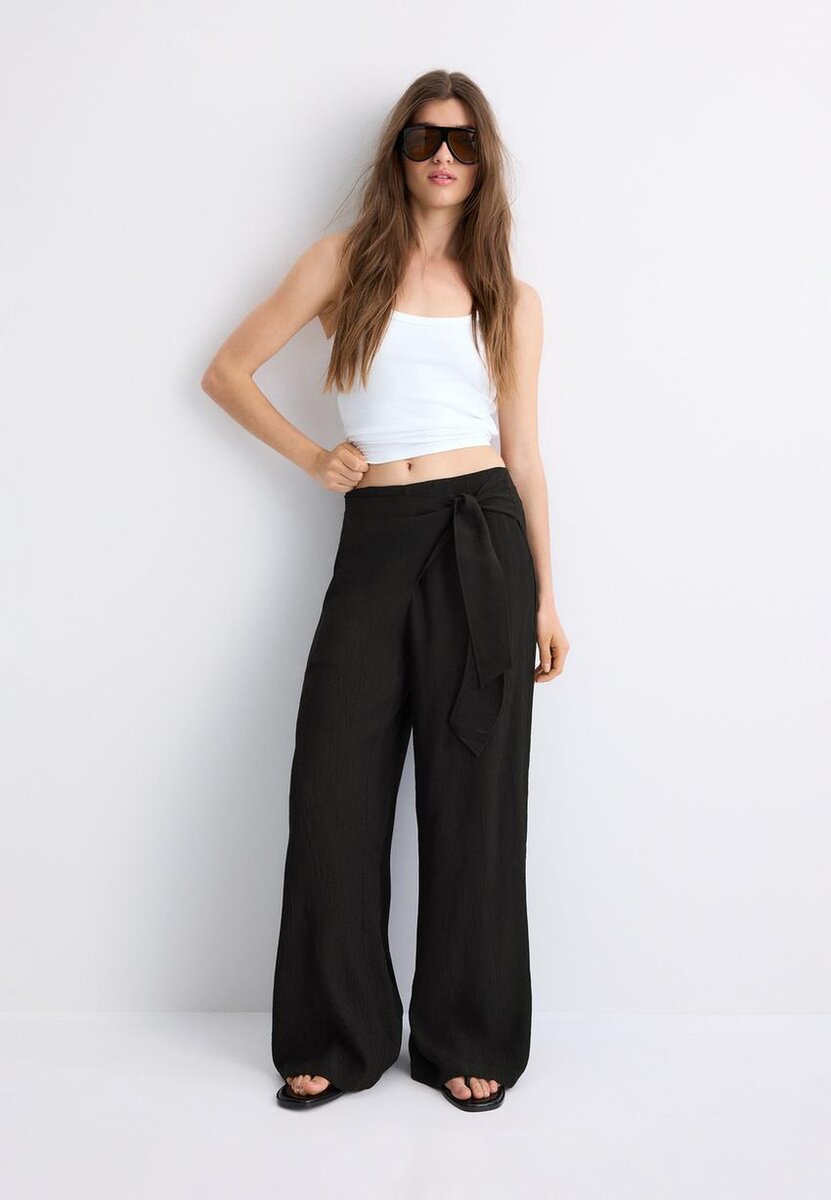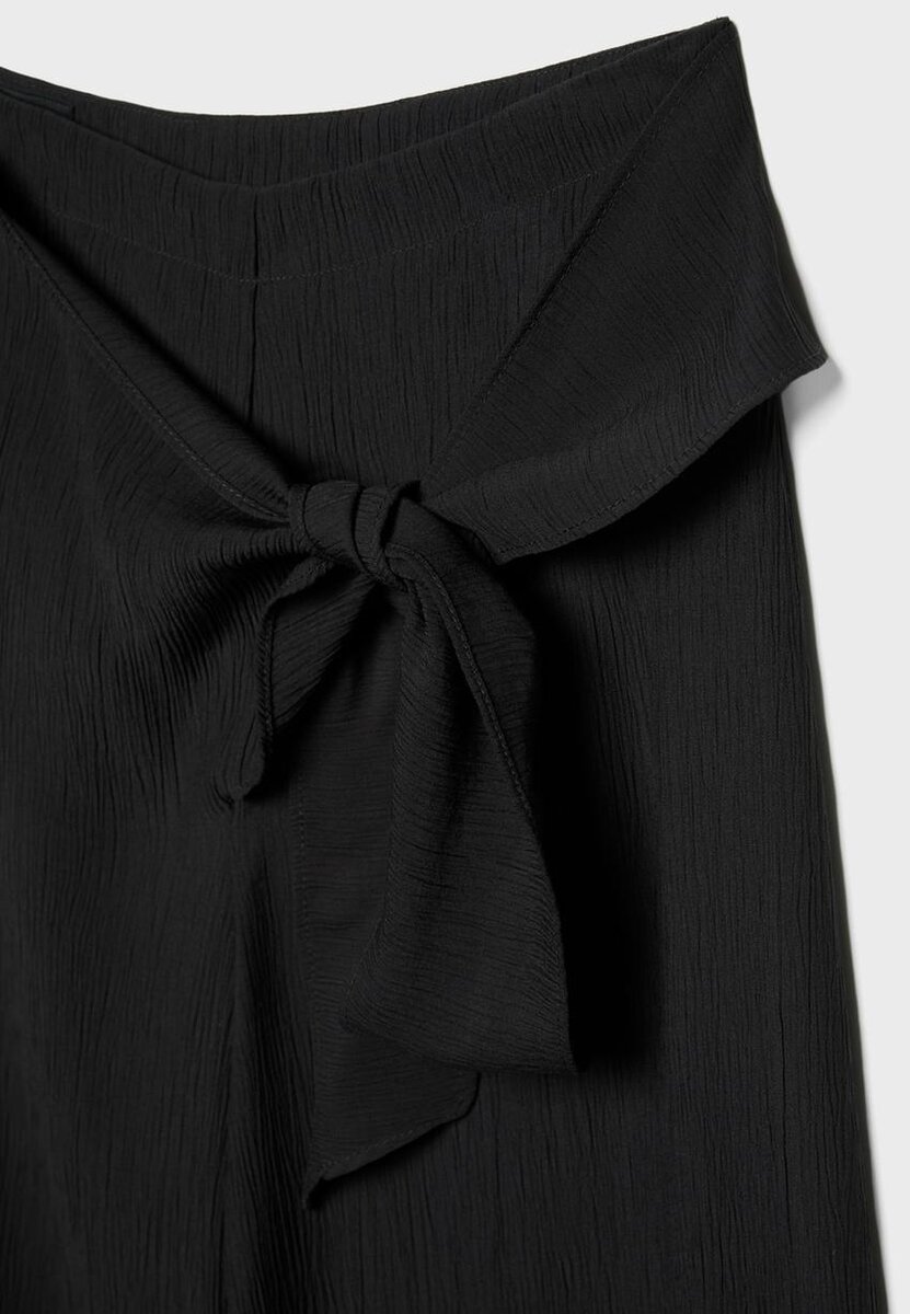 Pantalon fluide de style sarong à taille mi-haute et jambes Wide Leg. Fermeture à glissière latérale invisible. Nœud sur le devant. Disponible en plusieurs couleurs.