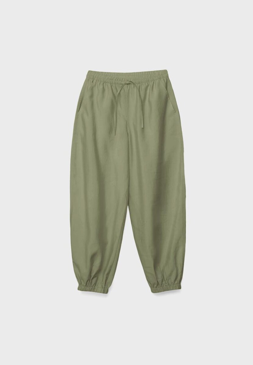 Pantalon sarouel. Doté d’une taille élastiquée avec cordon de serrage réglable dans le même tissu. Poches latérales. Ourlet élastiqué. Disponible en plusieurs couleurs.