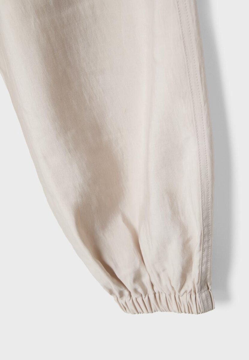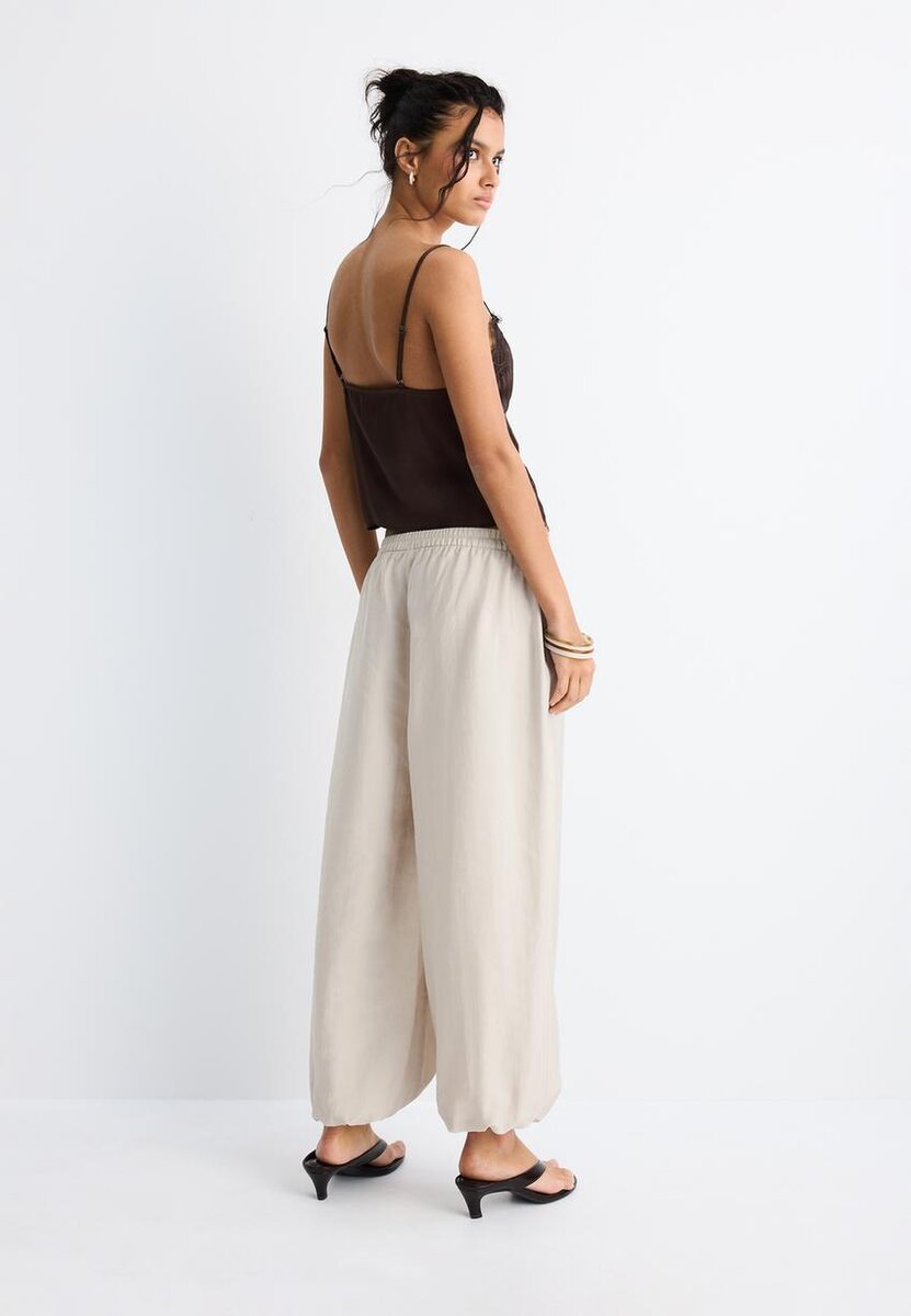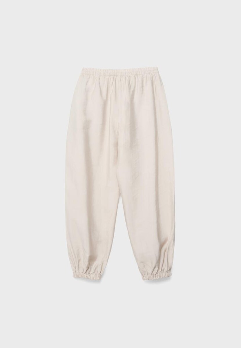 Pantalon sarouel. Taille élastiquée avec cordon de serrage réglable dans le même tissu. Poches latérales. Ourlet élastiqué. Disponible en plusieurs couleurs.