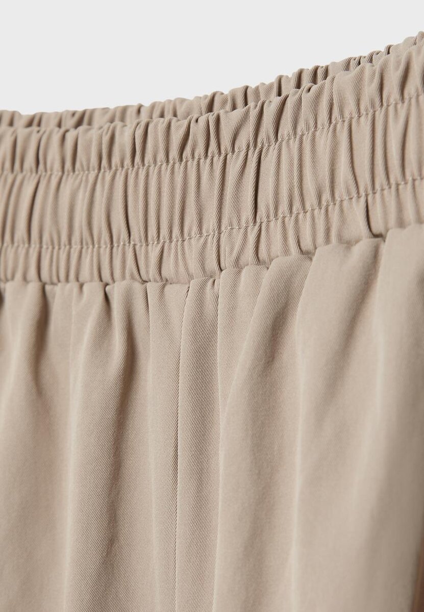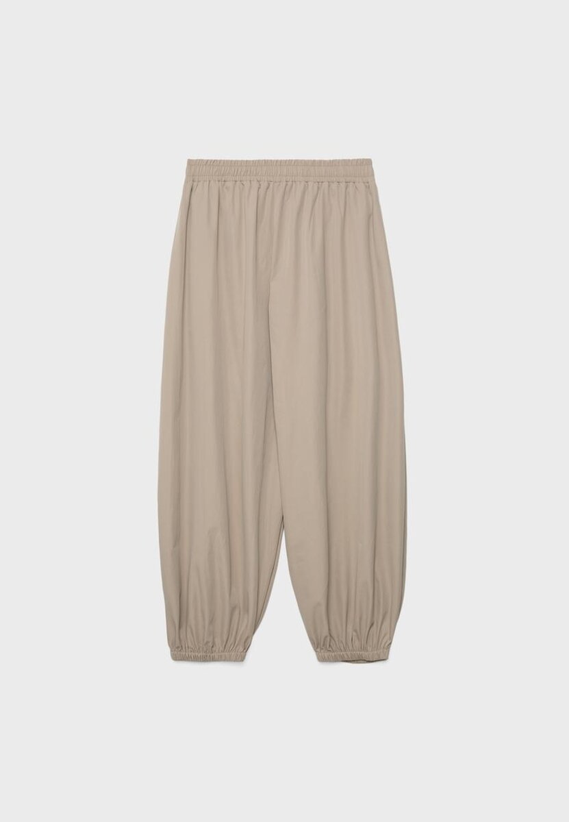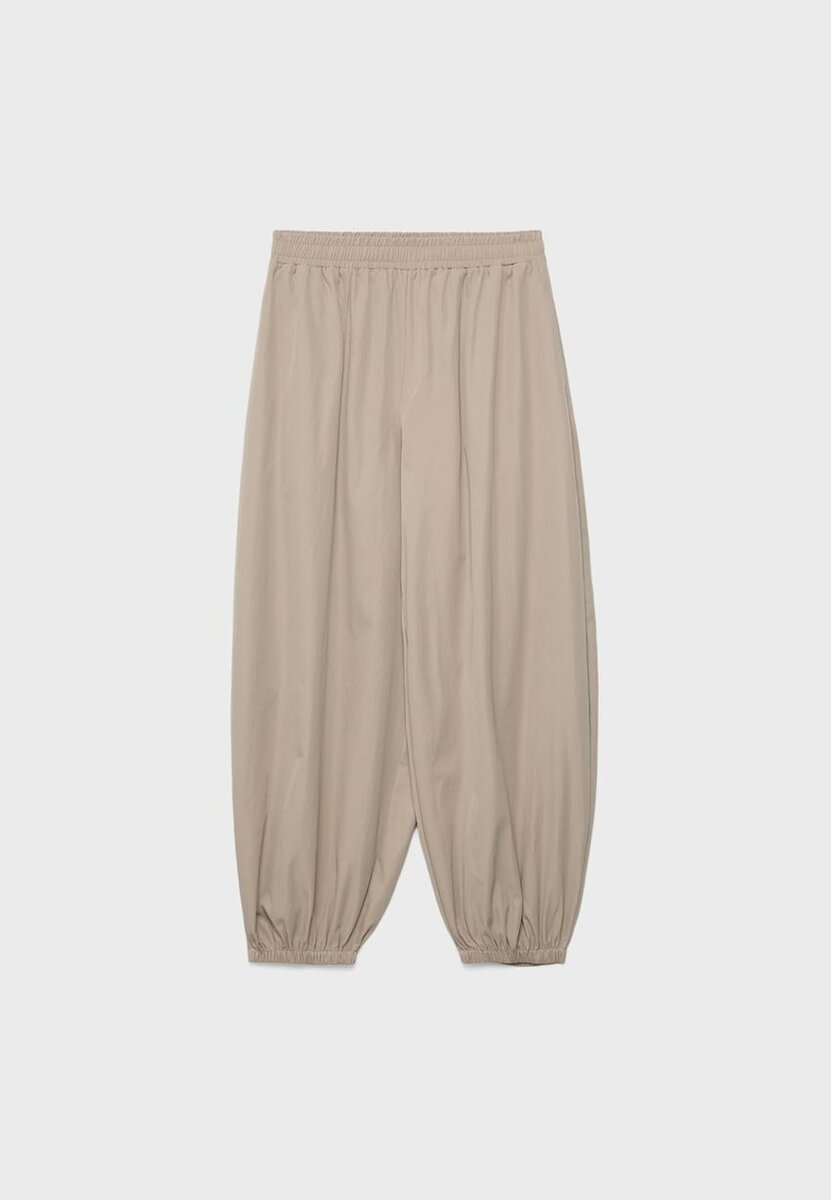 Pantalon ballon à taille mi-haute avec une ceinture élastiquée. Avec des plis creux sur le devant. Jambe large ballon avec ourlets élastiqués. Poches latérales. Disponible en plusieurs couleurs.