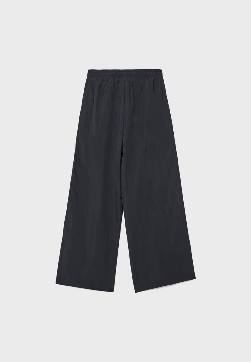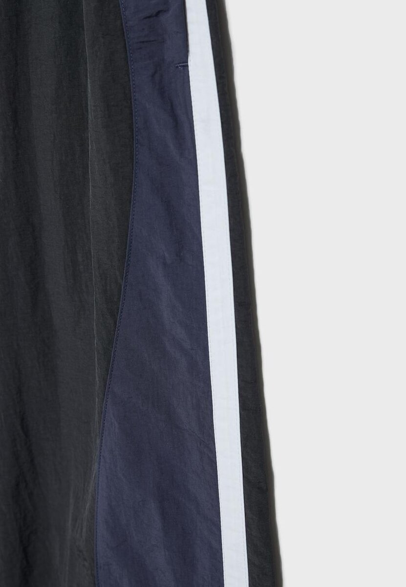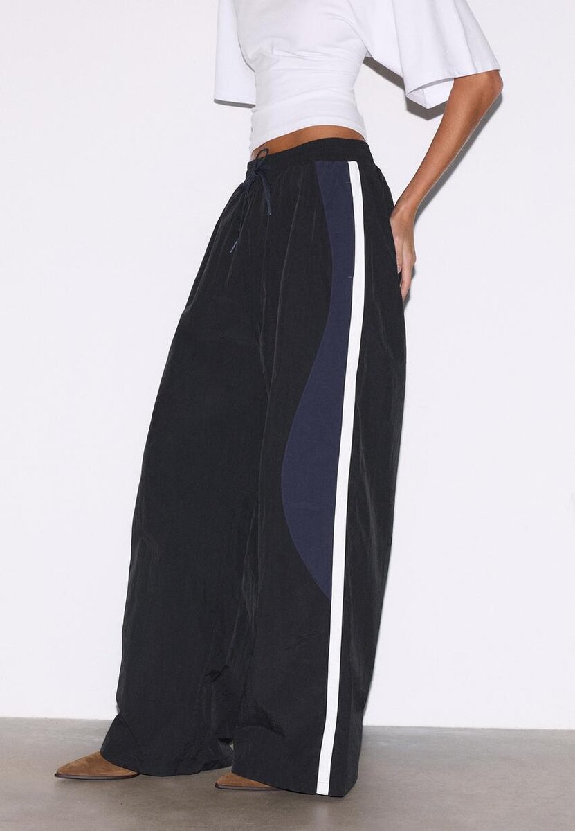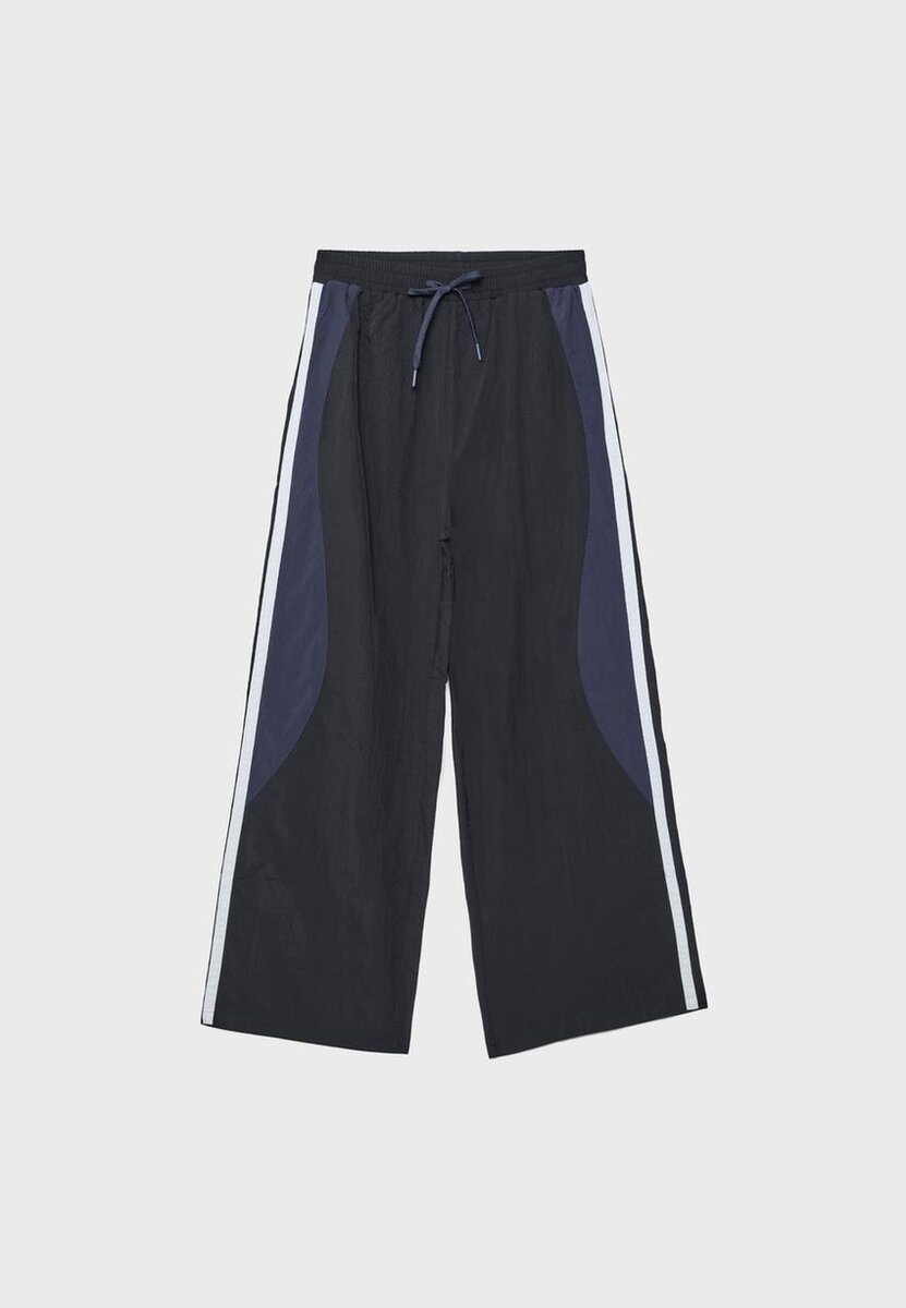 Pantalon de style technique. Doté d’une ceinture élastique ajustable avec cordon de serrage assorti, d’une coupe droite large et de poches latérales. Avec des rayures contrastées sur les côtés.