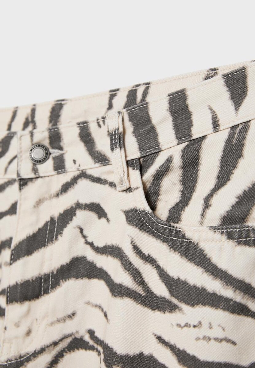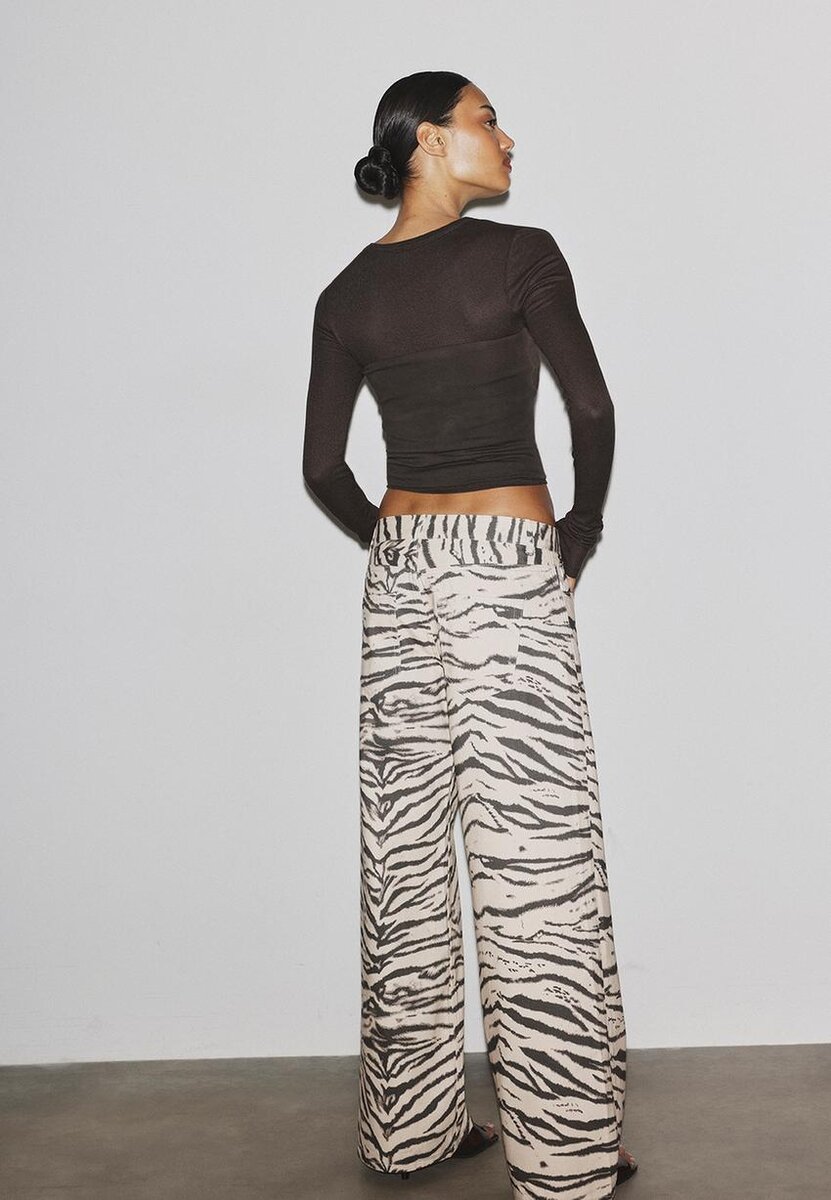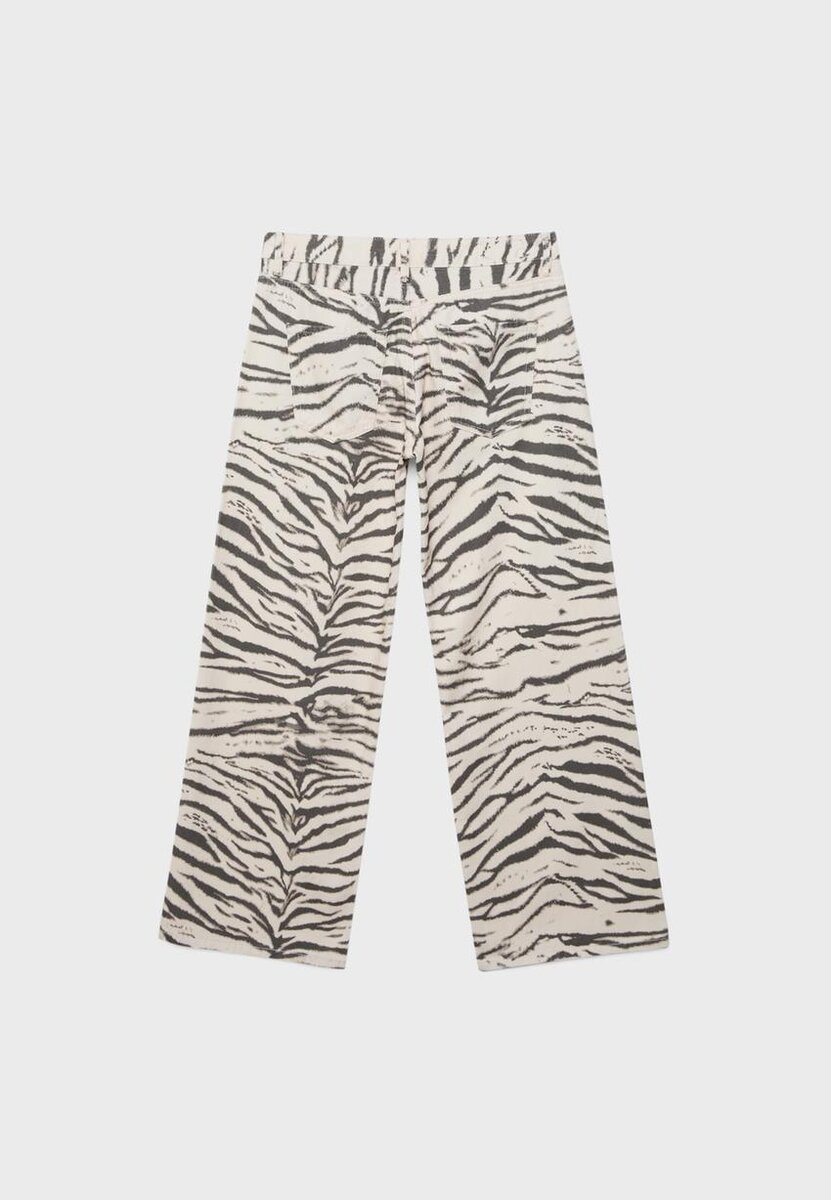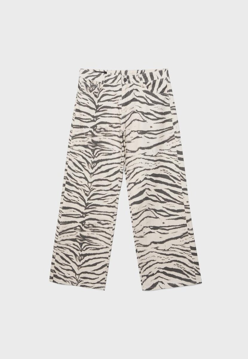 Pantalon à jambes larges avec cinq poches et passants de ceinture à la taille. Fermeture à glissière et boutons sur le devant. Détail en tissu imprimé animalier.