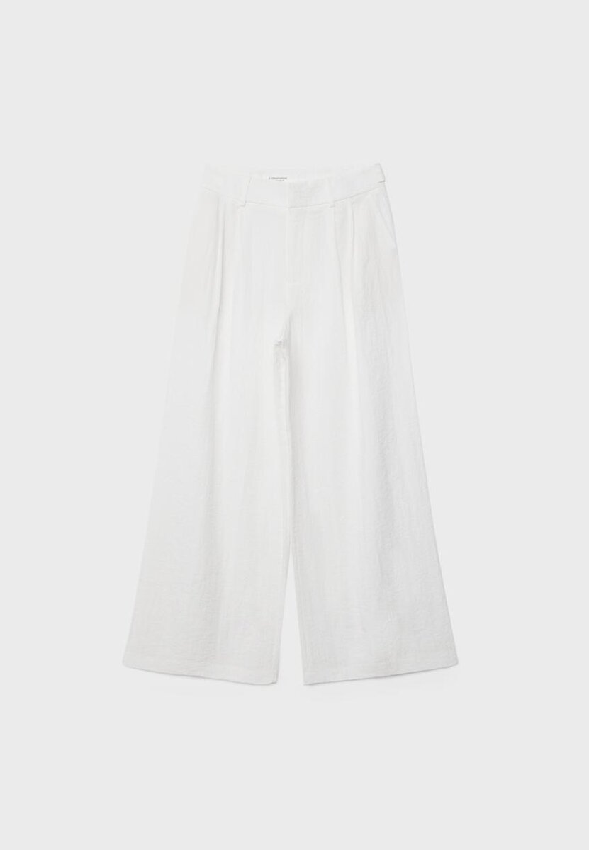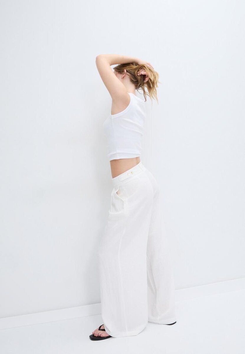 Pantalon fluide à taille mi-haute avec une ceinture ajustable à boutons. Doté de poches avant et de fausses poches passepoilées à l’arrière. Pinces à l’avant. Braguette zippée, bouton intérieur et fermeture à crochet métallique à l’avant. Disponible en plusieurs couleurs.