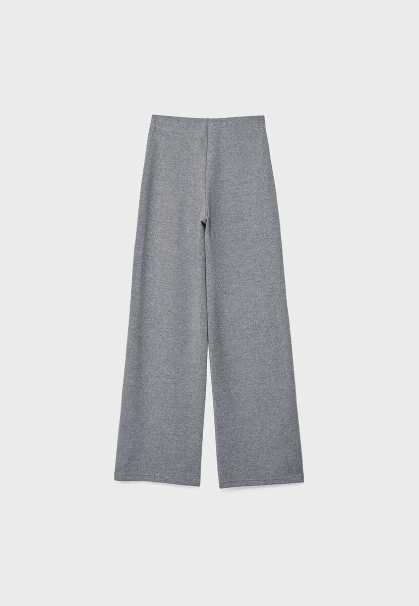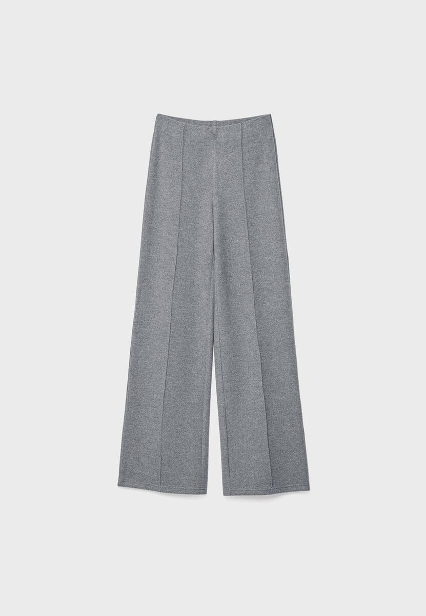 Pantalon en maille unie au Toucher doux. Taille mi-haute et ceinture élastiquée. Détails de coutures sur le devant et coupe droite. Disponible en plusieurs couleurs.