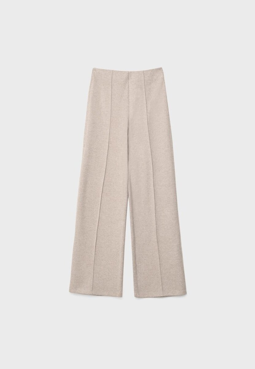 Pantalon en maille unie au Toucher doux. Taille mi-haute et ceinture élastiquée. Détails de coutures sur le devant et coupe droite. Disponible en plusieurs couleurs.