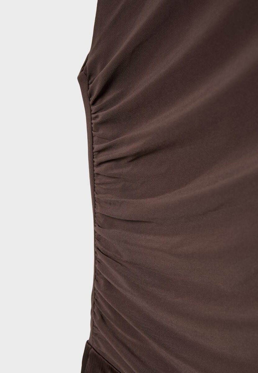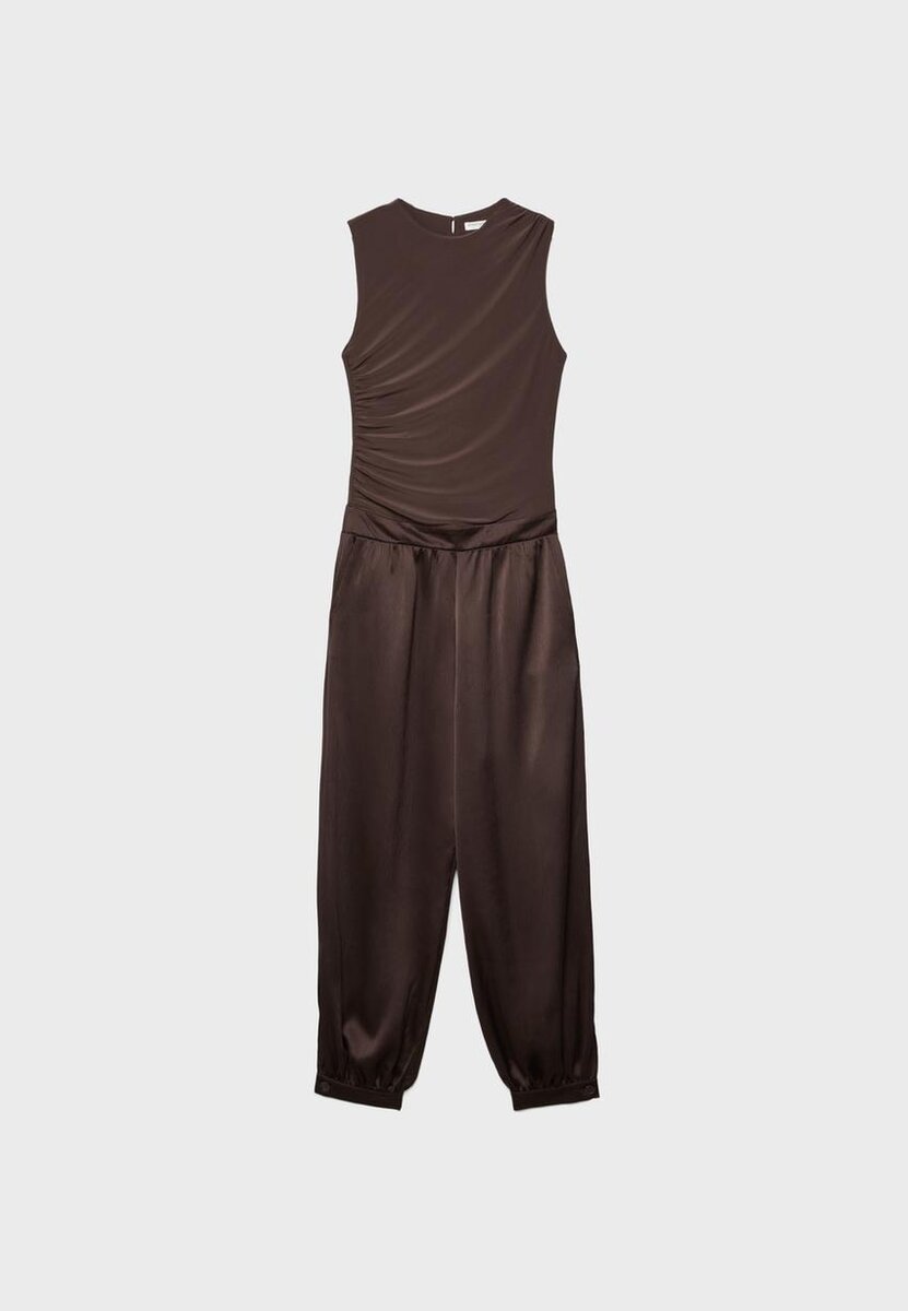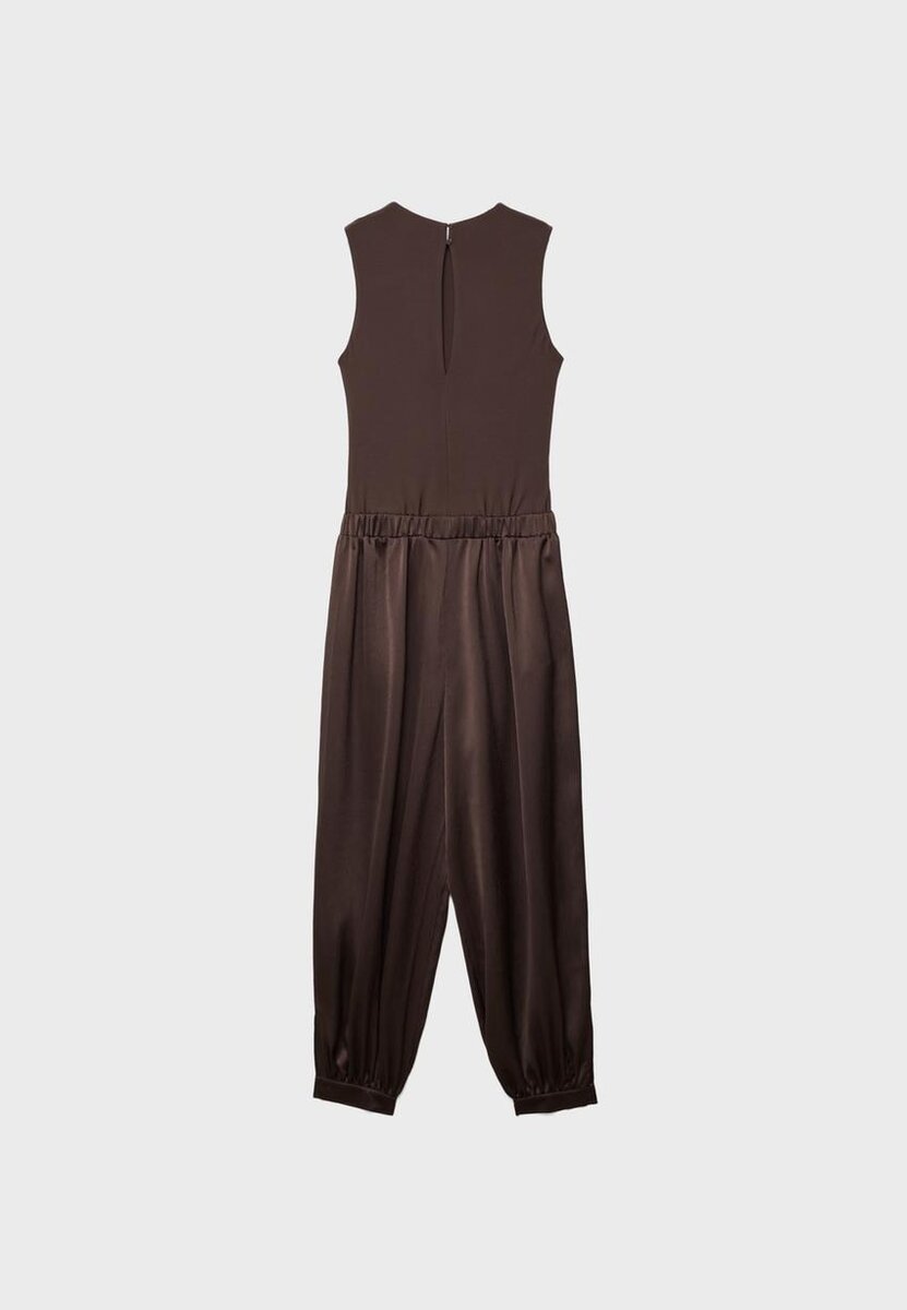 Combinaison longue à dos nu en tissu effet satin. Col rond et sans manches. Taille élastiquée. Poches latérales. Fermeture à boutons au niveau du cou et de l’ourlet. Fronces sur les côtés.