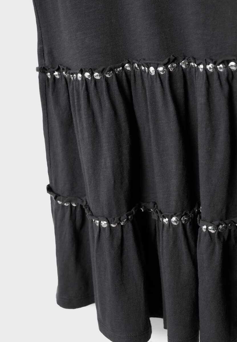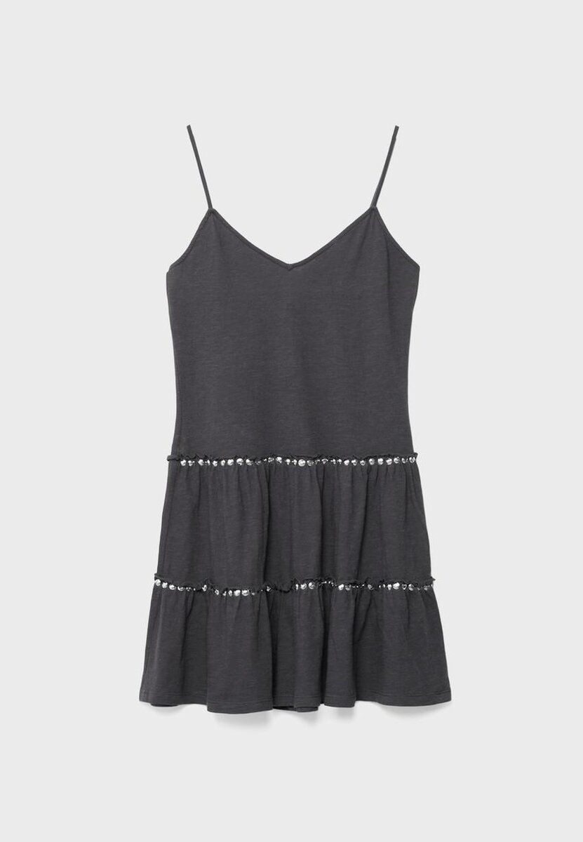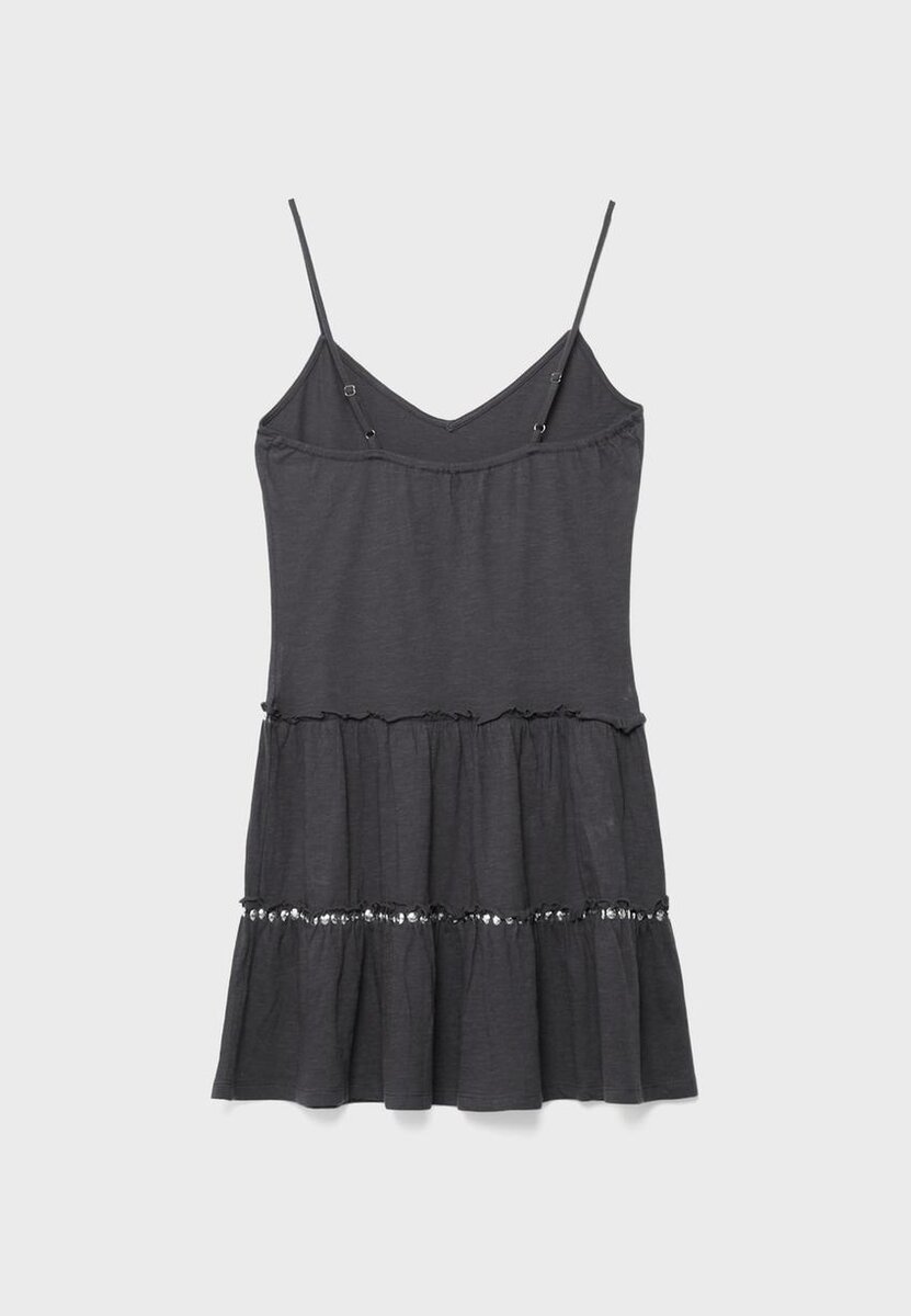 Robe courte à col en V et fines bretelles. Ourlet orné de volants et de clous.