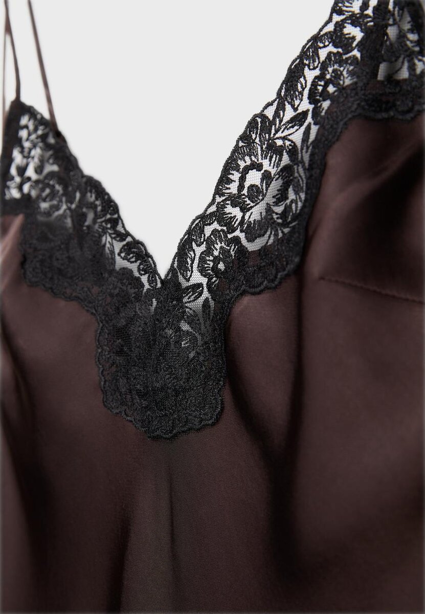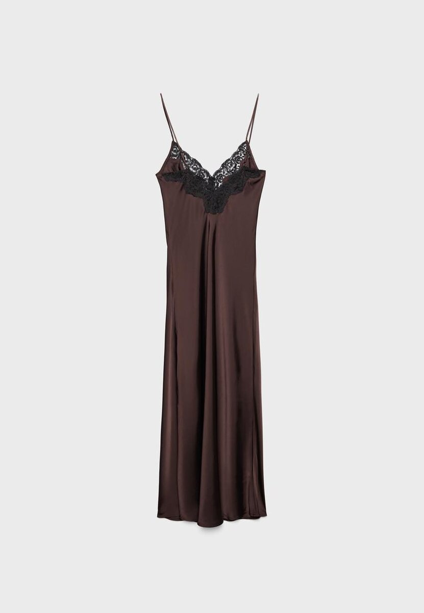 Robe midi en satin. Encolure en V avec application de dentelle et fines bretelles. Silhouette droite. Ourlet simple.