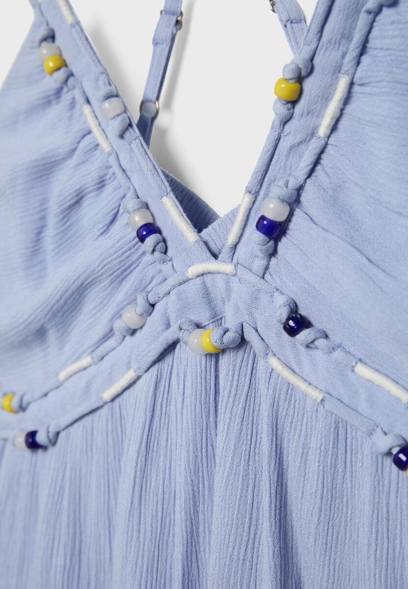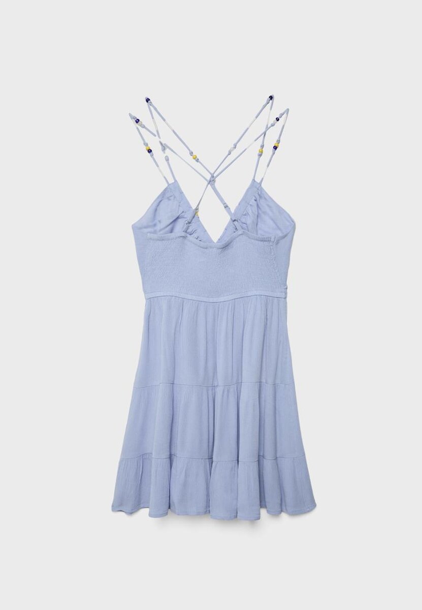 Robe courte en viscose. Col en V et fines bretelles. Dos nu avec bretelles croisées. Silhouette flared. Appliqués de perles sur l’encolure et les bretelles. Haut froncé. Ourlet à volants. Doublure ton sur ton.