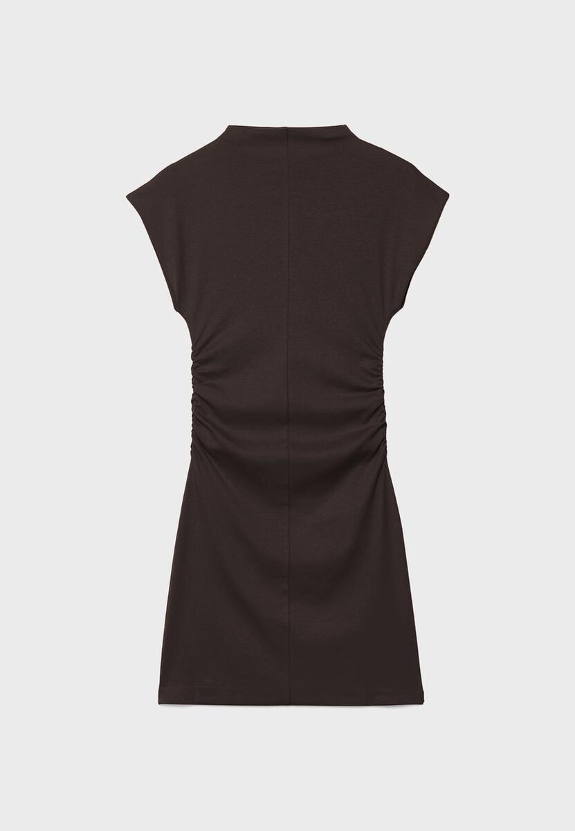 Robe courte avec encolure dos nu et sans manches. Silhouette ajustée avec détails froncés sur les côtés. Disponible en plusieurs couleurs.