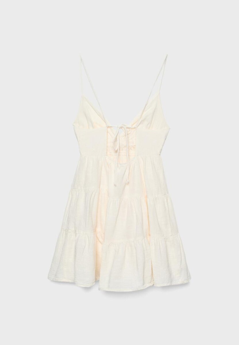 Robe courte fluide en coton. Avec encolure en V et bretelles spaghetti réglables avec nœud dans le dos. Dos nu et taille élastiquée.
