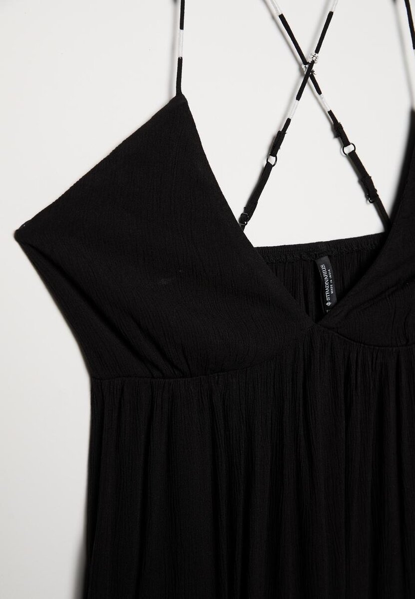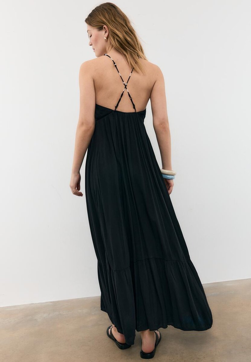 Robe longue en crêpe de viscose. Avec encolure en V, fines bretelles ornées de perles, dos croisé, fronces sous la poitrine, ourlet à volants et doublure assortie.