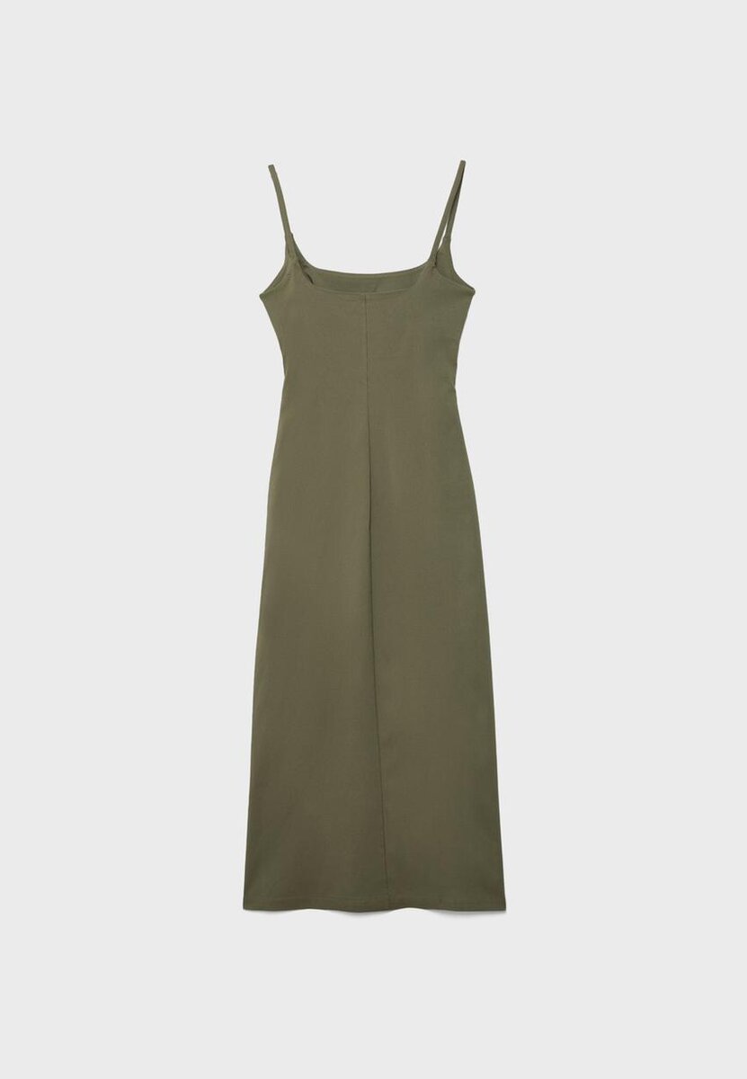 Robe mi-longue en bengaline à encolure carrée et bretelles. Avec des fronces sur les côtés et une fente sur le devant.