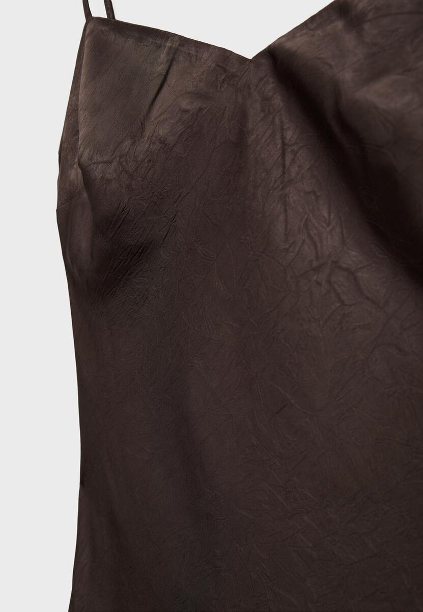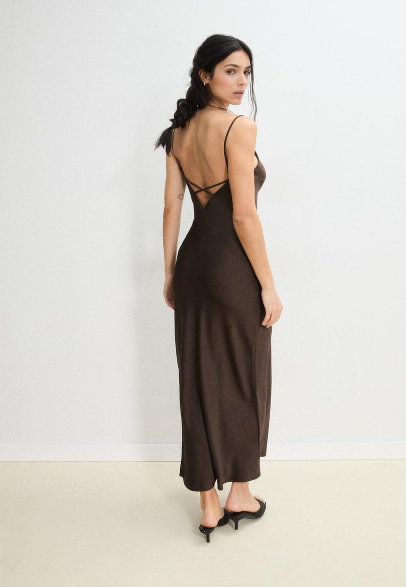 Robe mi-longue en satin avec un décolleté en cœur et des bretelles fines. Avec un détail croisé dans le dos. Disponible en plusieurs couleurs.