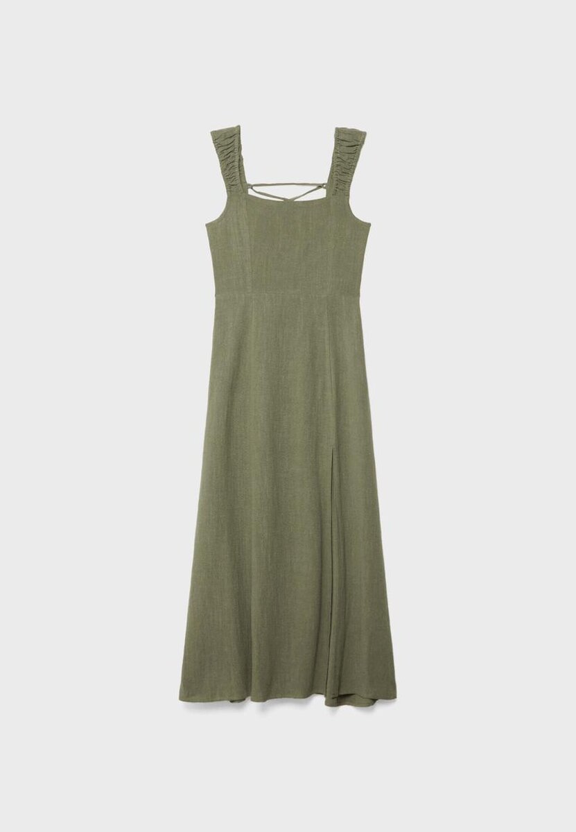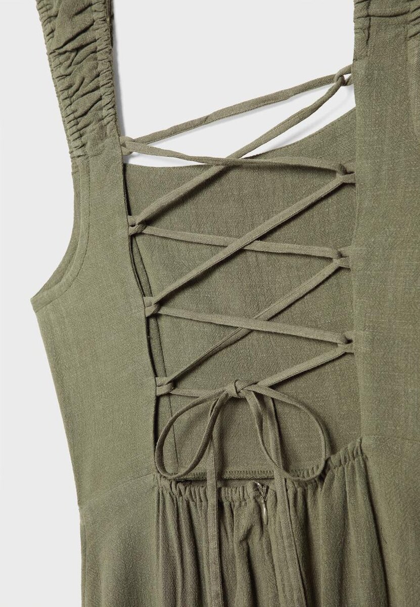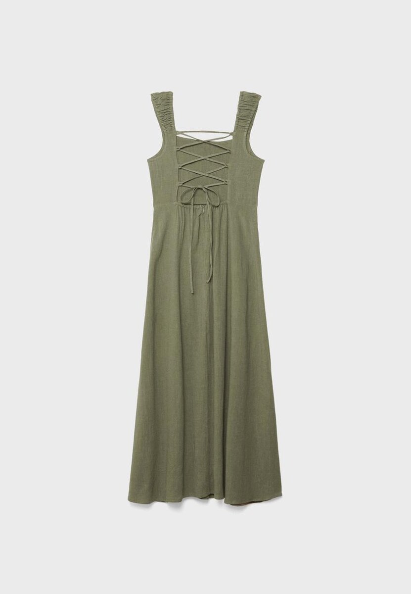 Robe mi-longue fluide en tissu effet lin. Avec encolure droite et bretelles élastiques à fronces. Dos nu avec bretelles croisées réglables et nœud. Fermeture à glissière dissimulée dans le dos. Disponible en plusieurs couleurs.