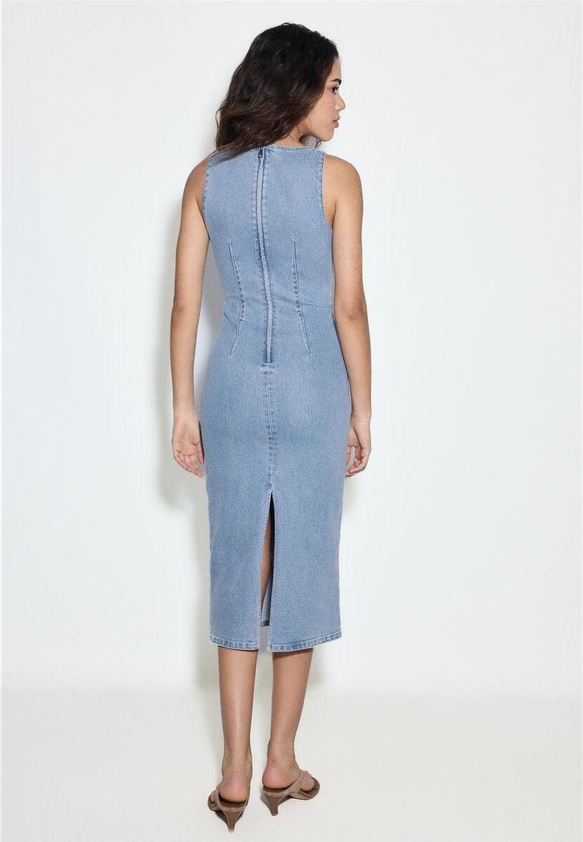 Robe midi en denim à encolure carrée et larges bretelles. Fermeture à glissière dans le dos.