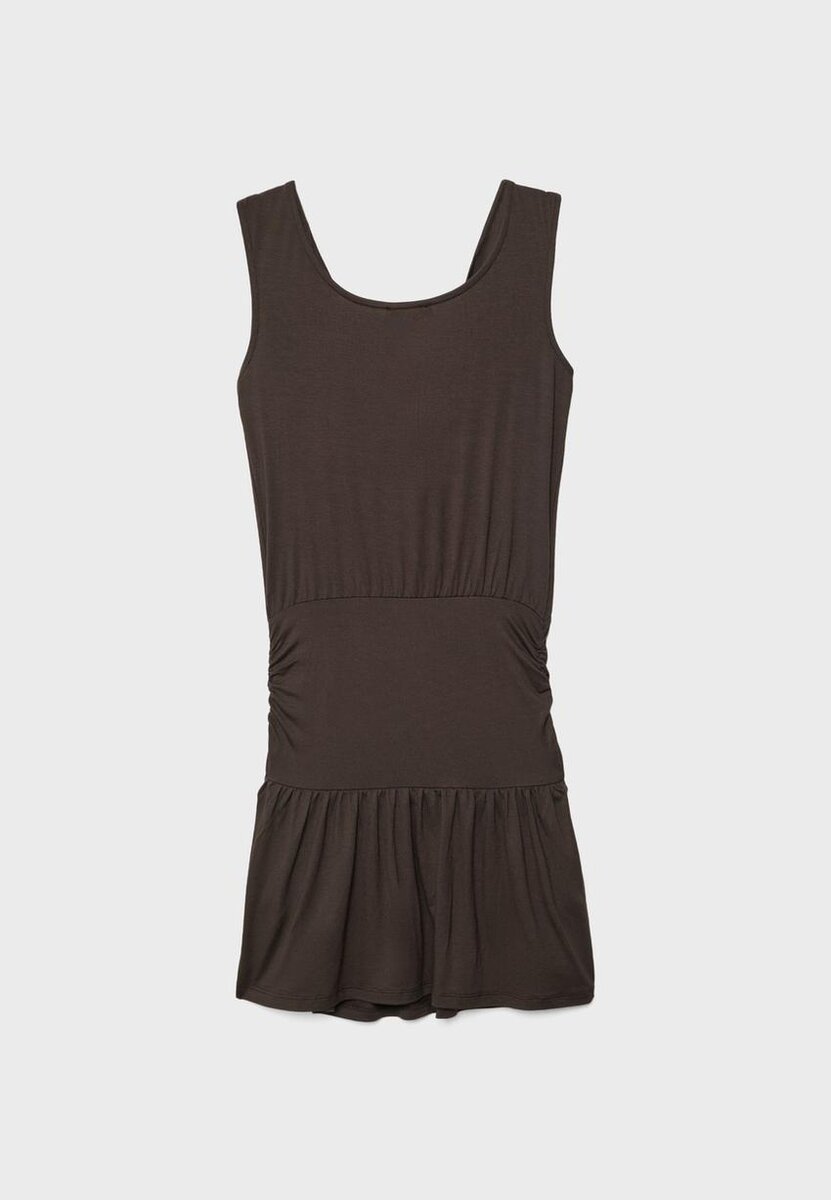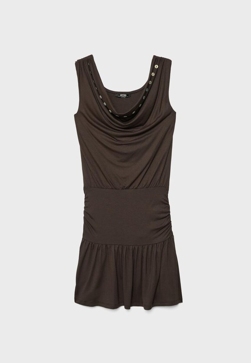 Robe polyvalente à encolure ronde et sans manches. Avec une ceinture ajustée, un tissu froncé et des boutons.